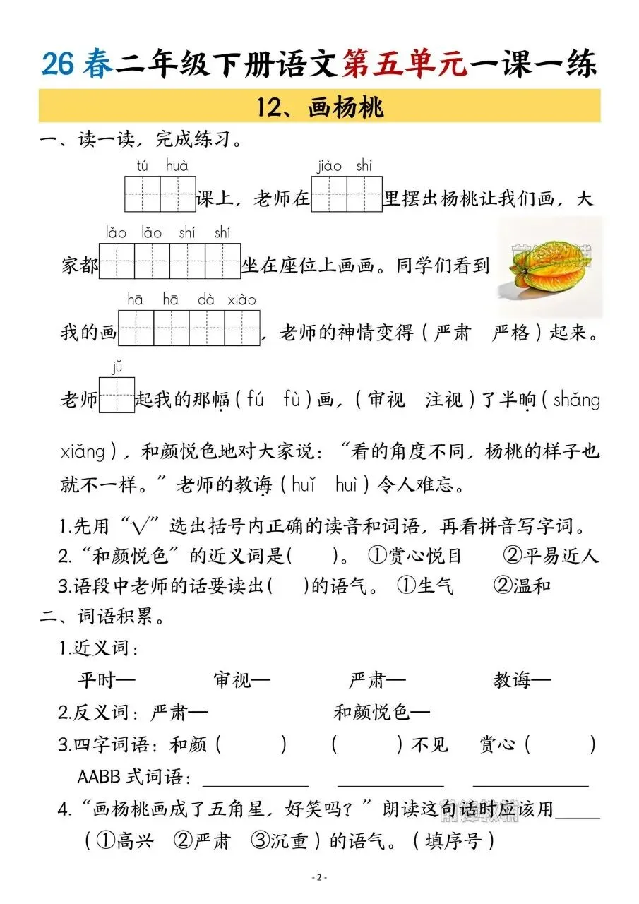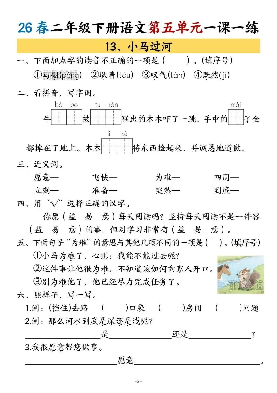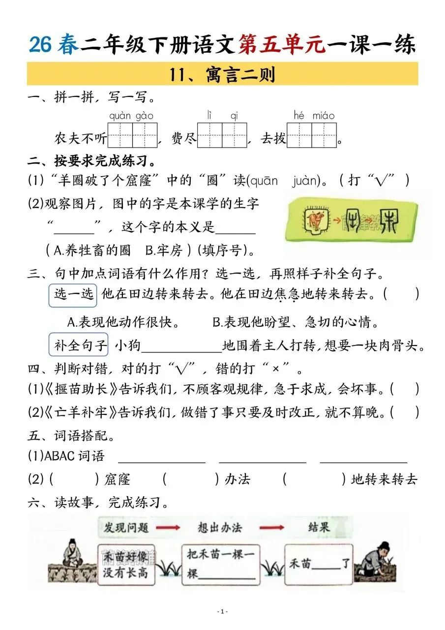 26春二年级下册语文第五单元一课一练电子版免费下载!