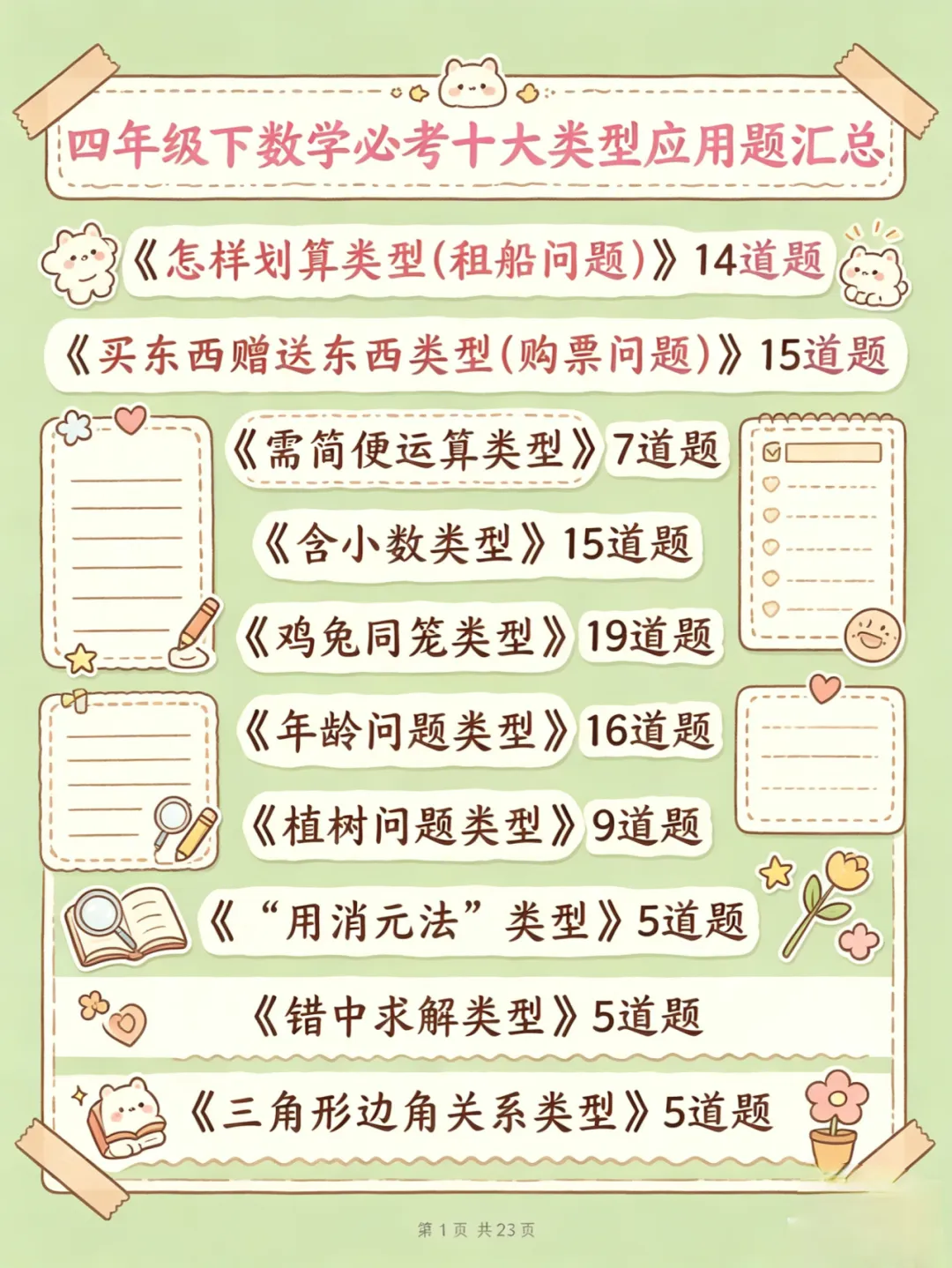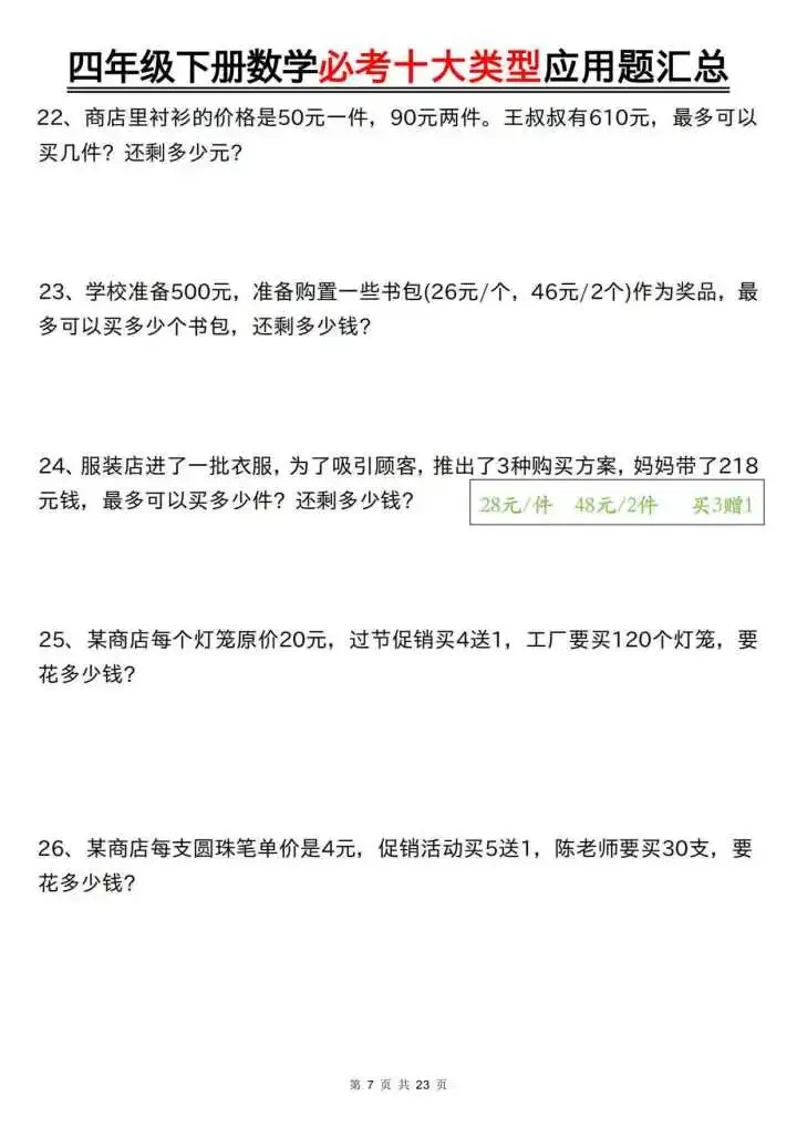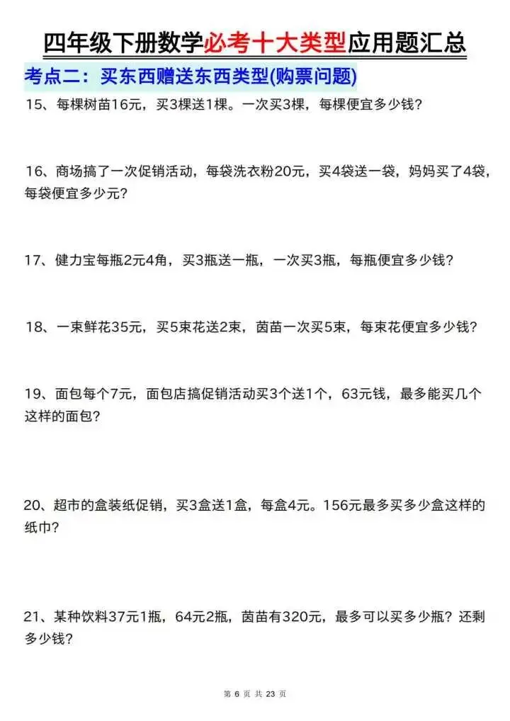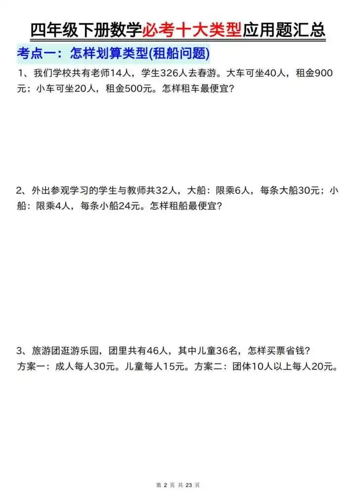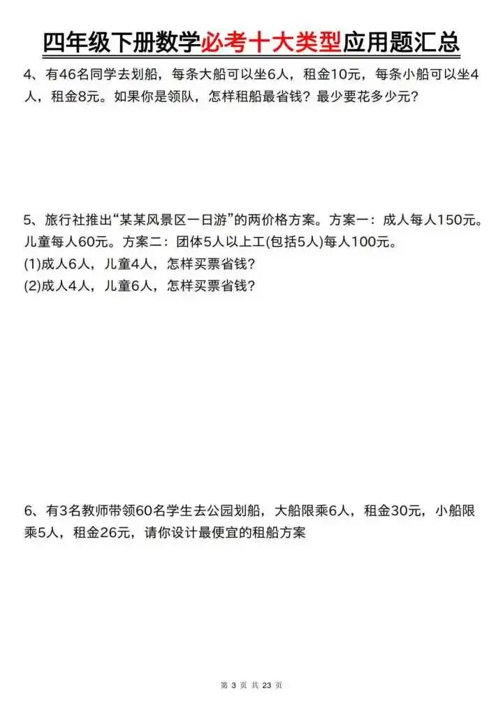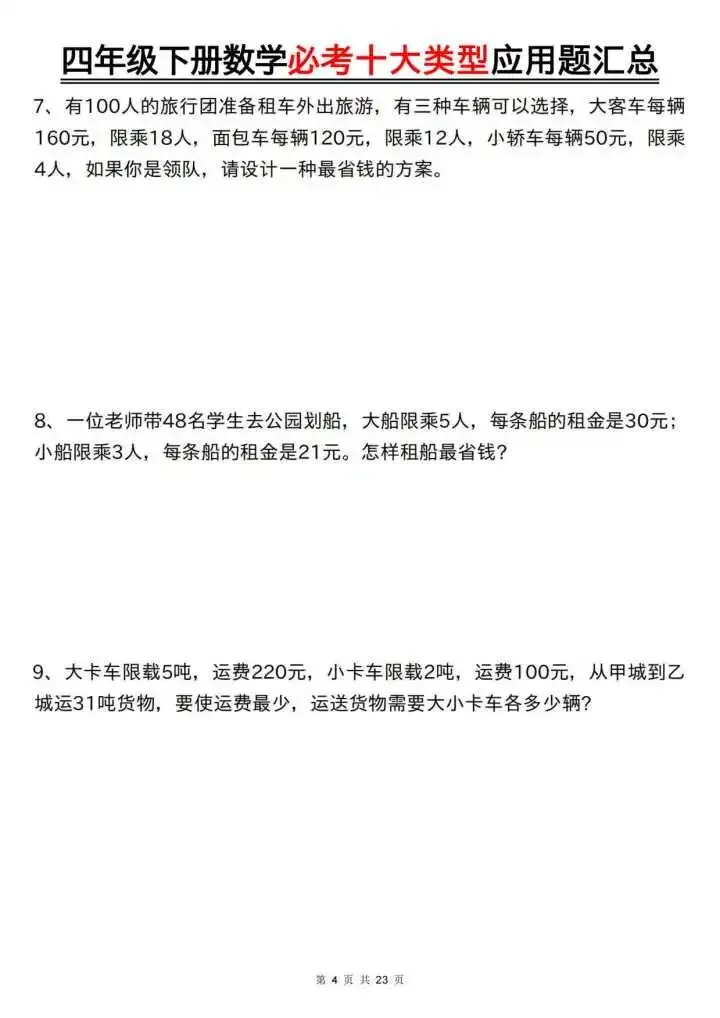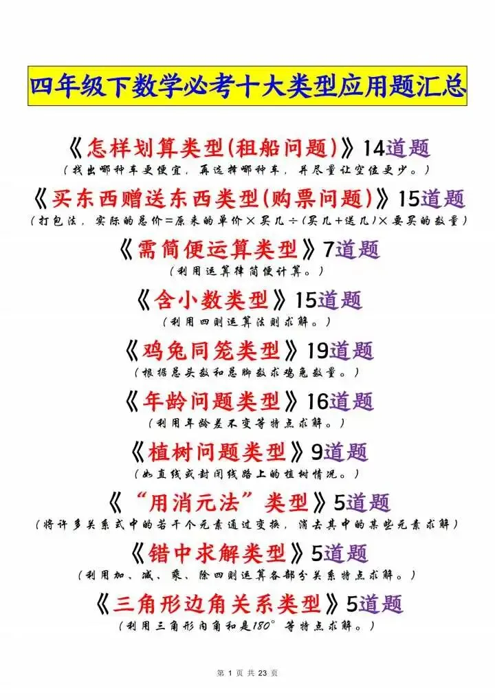 今天给大家分享的是四下数学必考十大类型应用题汇总