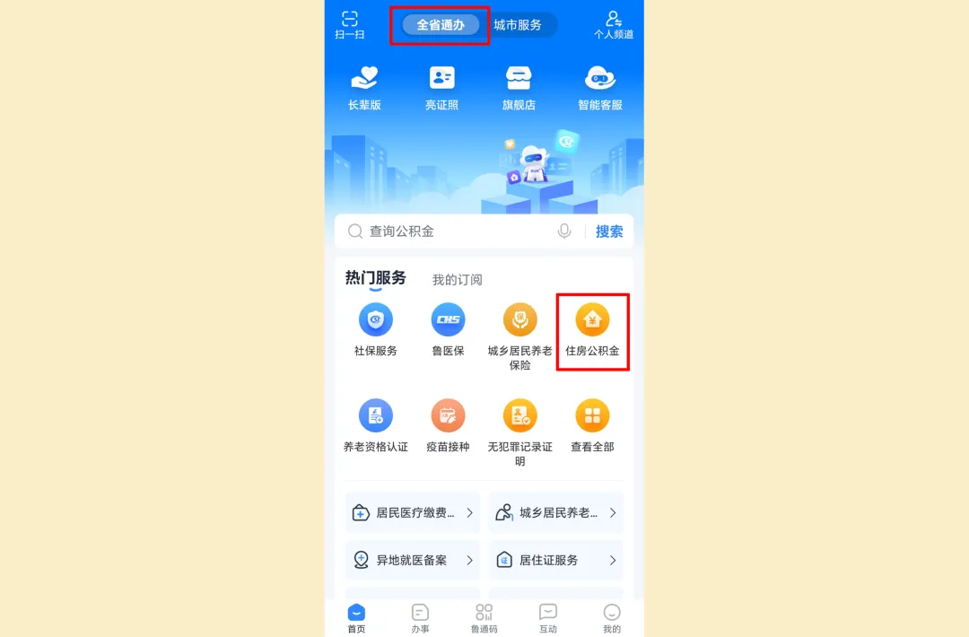 1.下载安装“爱山东”手机APP,注册登录后在“首页”中点击“全省通办”选项,在热门服务中点击“住房公积金”。如下图: