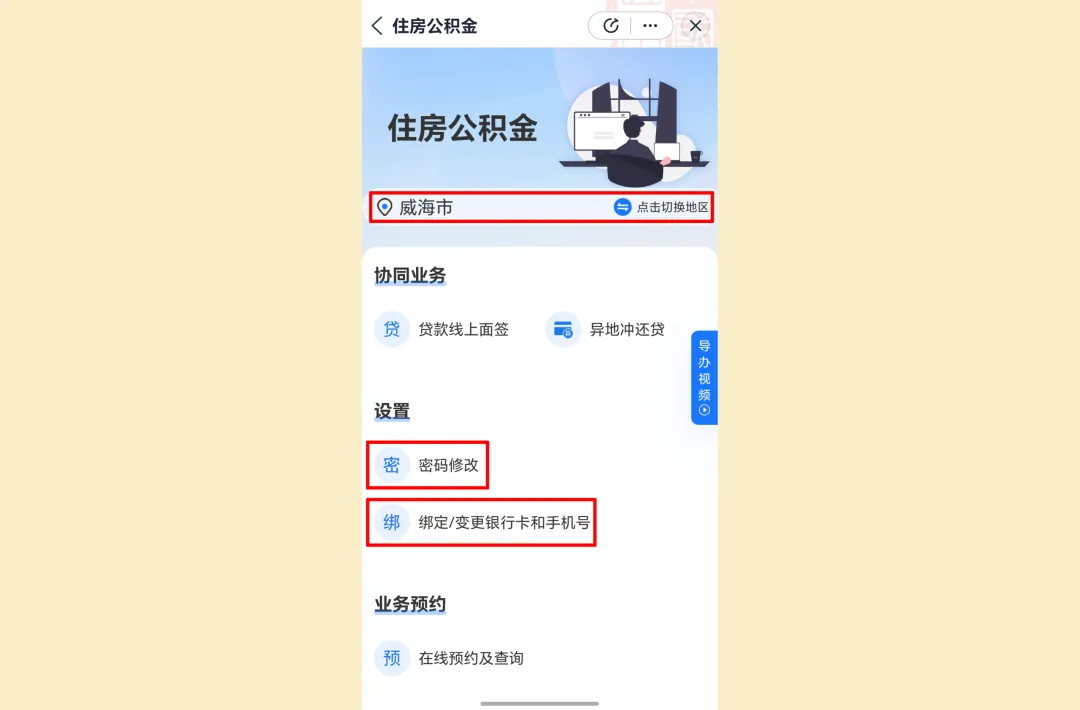 2.进入住房公积金服务大厅后,将定位设置为“威海市”,不知道公积金查询密码的职工,通过爱山东认证后,可以直接进行“密码修改”,密码修改后再进行“绑定/变更银行卡和手机号”。如下图: