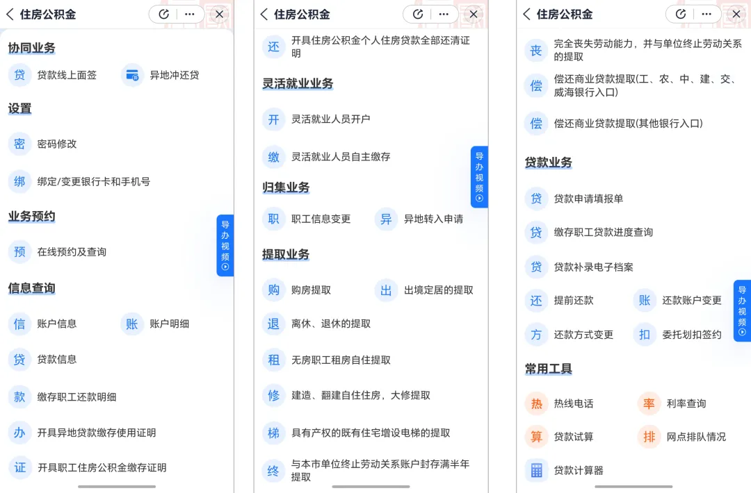 3.绑定成功后,就可以在“住房公积金服务大厅”办理公积金相关业务。目前可以办理的公积金业务如下图: