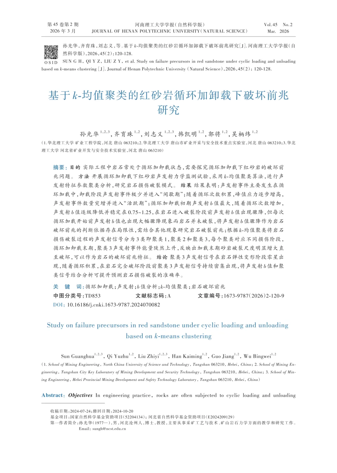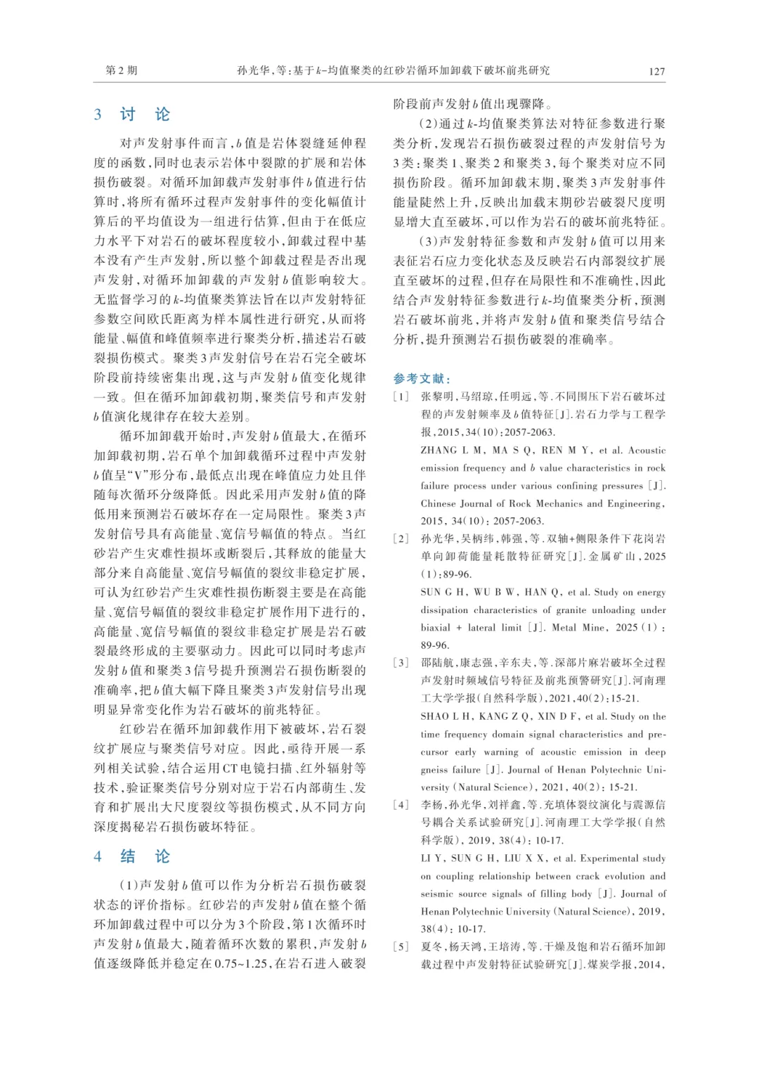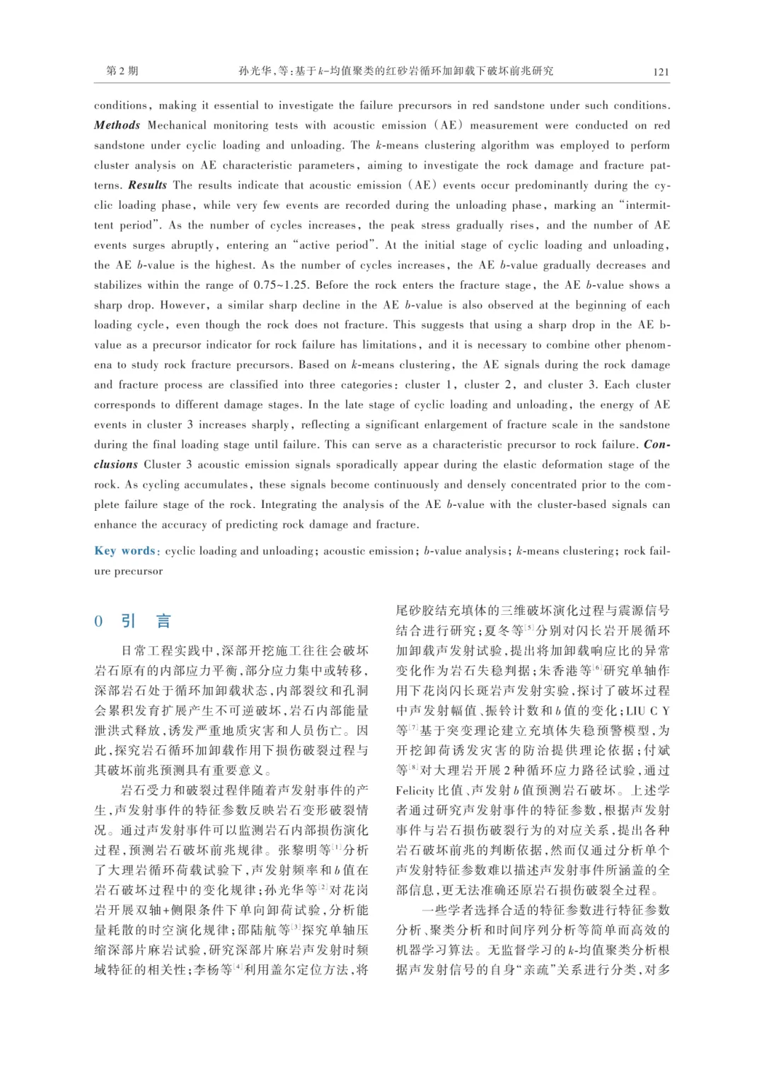 孙光华,齐育珠,刘志义,等.基于k-均值聚类的红砂岩循环加卸载下破坏前兆研究[J].河南理工大学学报(自然科学版),2026,45(2):120-128.