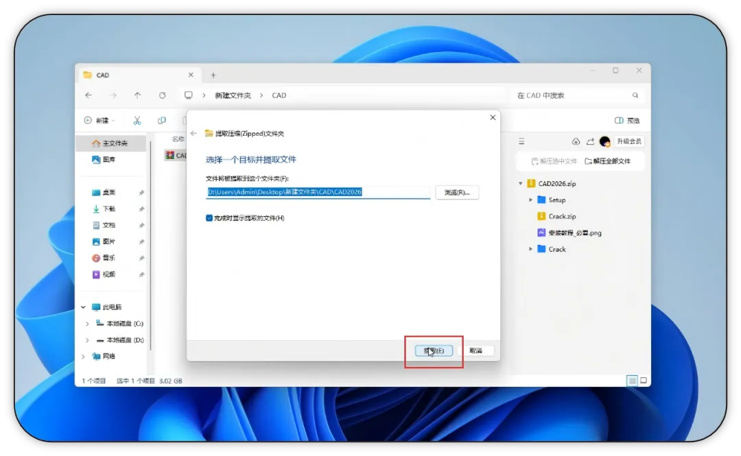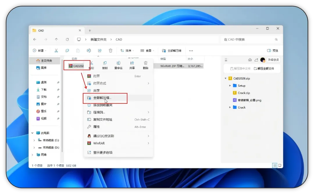 1. 找到下载好的 CAD 安装压缩包,鼠标右键点击,选择【全部解压缩】,开始解压安装包文件。