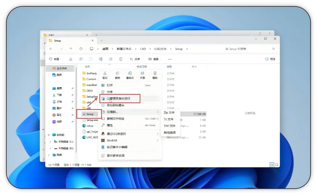 4. 在文件夹内找到【setup】主程序,右键点击该文件,选择【以管理员身份运行】。
