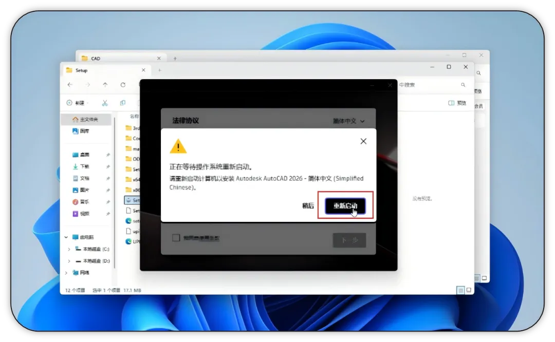 弹出重启提示窗口,直接点击【重新启动】。