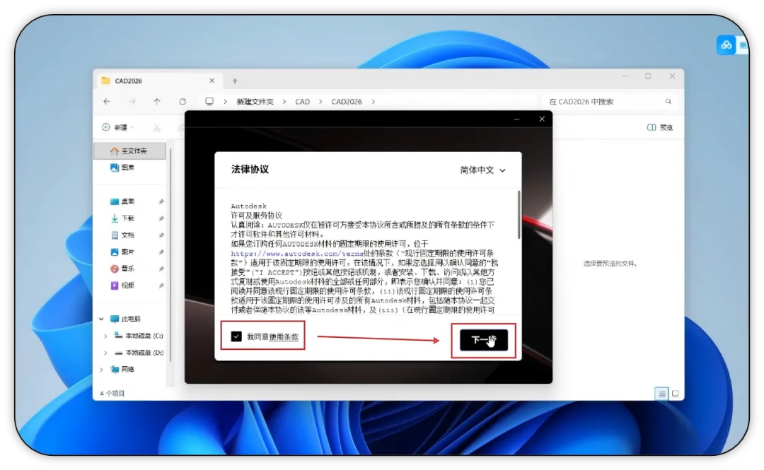 6. 重启完成后,重新进入安装界面,勾选同意使用条款,确认无误后点击【下一步】。