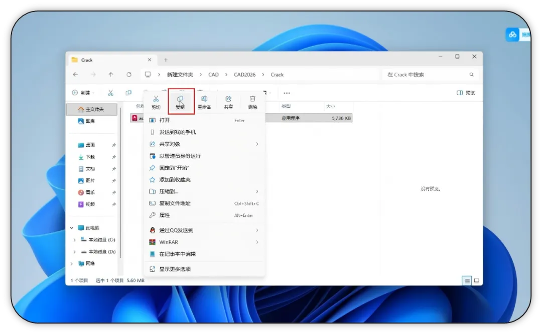 10. 在文件夹内选中【acad】程序文件,右键点击选择【复制】。