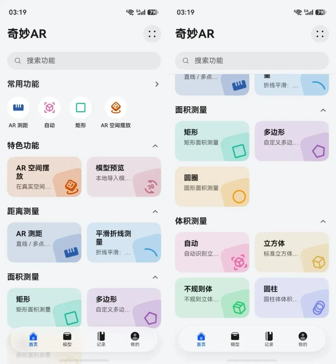 AR空间量放、模型预览;距离测量:AR测量、平滑折线测量;面积测量:矩形、多边形、圆圈;体积测量:立方体、不规则立体型、圆柱等