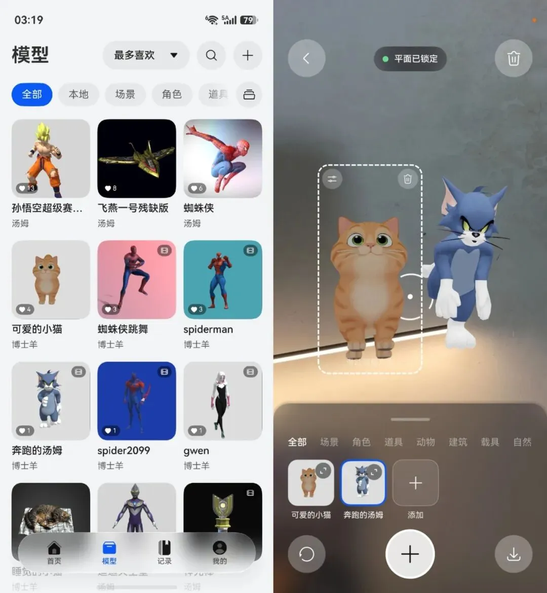 在真实环境中加载模型,支持平移、旋转、缩放等,可以云端模型或本地导入、本地摆放入口支持OBJ、GLTF、GLB等