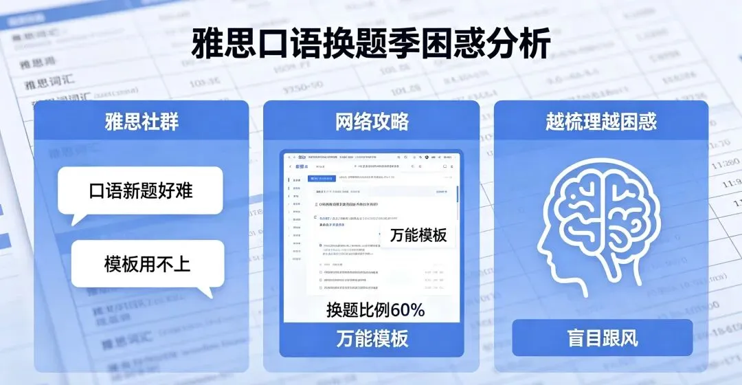 雅思社群中满是对于新题的担忧,网络上的换题季攻略多是换题比例罗列,或是缺乏实操性的模板建议,越梳理越困惑,最终陷入盲目跟风困境。