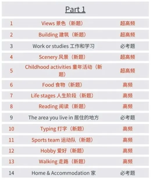 结合近5年数据拆解:Part1换题比例约30%,新增5-8个新话题,剩余11-13道为上季度保留题,家乡、学习与工作等基础话题全年稳定,是必抓的“保底得分点”。