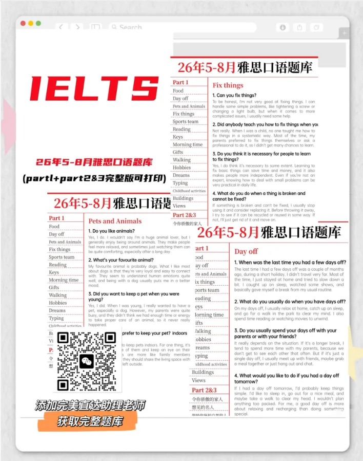 我们已整理5-8月雅思口语换题季完整保留题清单,涵盖Part1、Part2、Part3高频题及配套语料,无需自行整理,可直接用于备考。