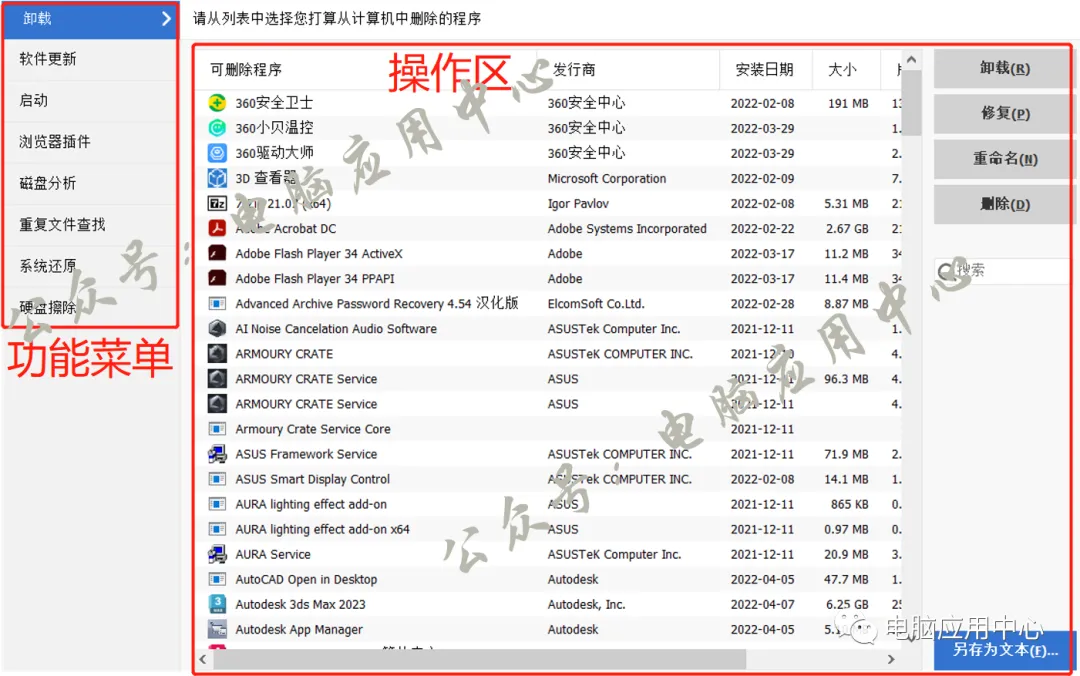 4、还有一些实用的工具,比如:卸载软件、软件更新、开机快速启动、浏览器插件管理、磁盘分析、重复文件查找、系统还原、硬盘搽除等