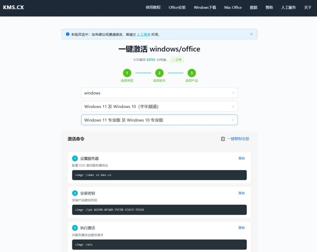 一键搞定 Windows/Office 激活,小白也能零门槛上手保姆级操作指南,跟着做就行打开网站,选择激活类型进入 kms.cx 主页,第一步先选要激活的类型:Windows 系统或者 Office 办公软件,这里以 Windows 为例。(配图:网站首页截图,圈出 “选择类型” 下拉框)选择对应版本,生成激活脚本第二步选你的系统版本,比如 Windows 11 专业版、Windows 10 家庭版,选好后网站会自动生成专属激活命令,直接复制就行。(配图:选择版本后的页面截图,圈出生成的脚本区域)以管理员身份运行 CMD,执行激活命令按下 Win+X,选择 “终端 (管理员)” 或 “命令提示符 (管理员)”,把复制的命令粘贴进去,按回车运行,等几秒就能看到激活成功的提示啦。(配图:CMD 运行激活命令的界面截图,打码关键信息)网站地址 : https://kms.cx/