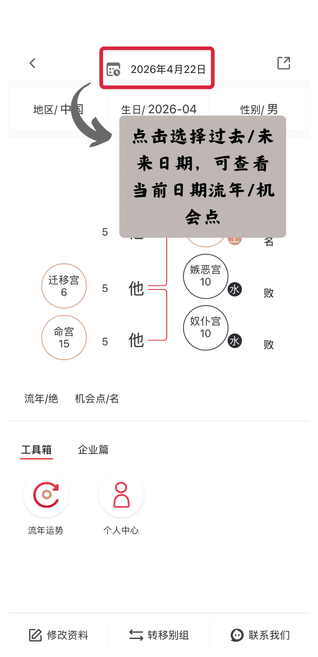 格局页点击最上方日历可选过去/未来日期,查看当前日期的流年和机会点
