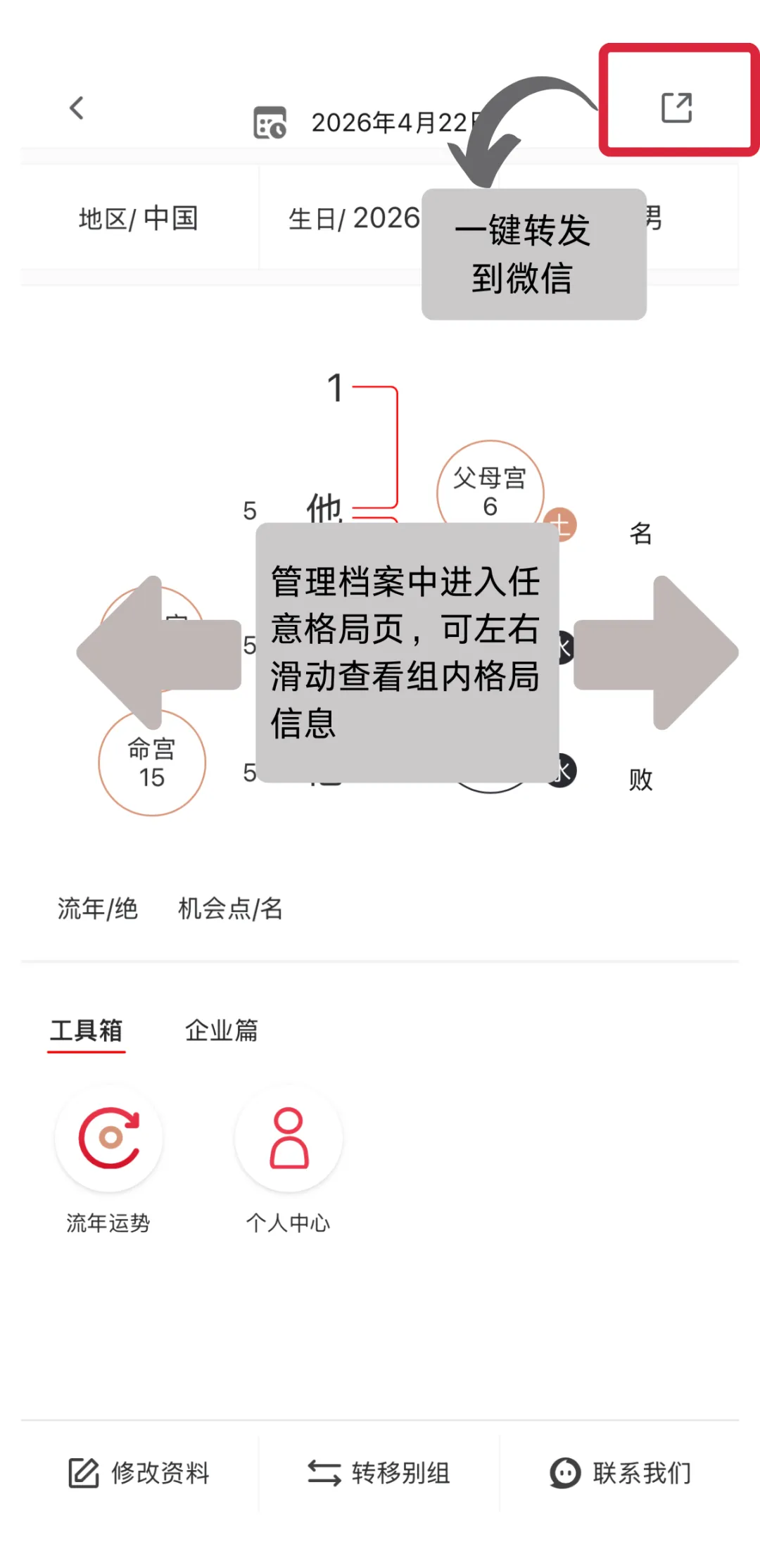 在管理档案中查看任意分组中的姓名,向左/向右滑动可以直接查看该分组的全部格局信息