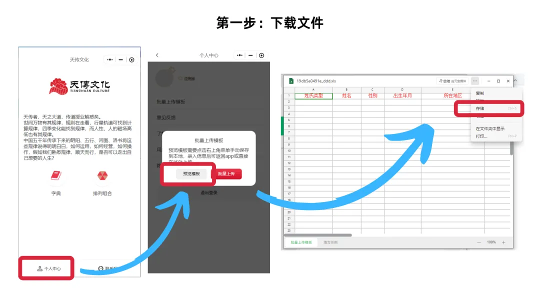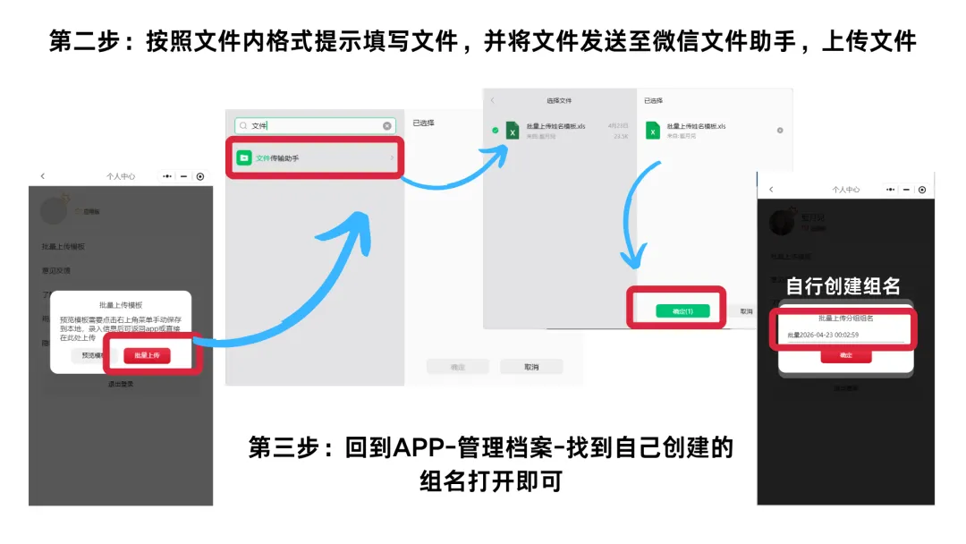 路径:小程序-个人中心-批量上传模板-下载模版-填写完毕后将文件发送到微信文件传输助手-上传模板-成功后回到APP-管理档案
