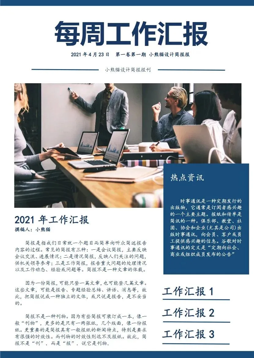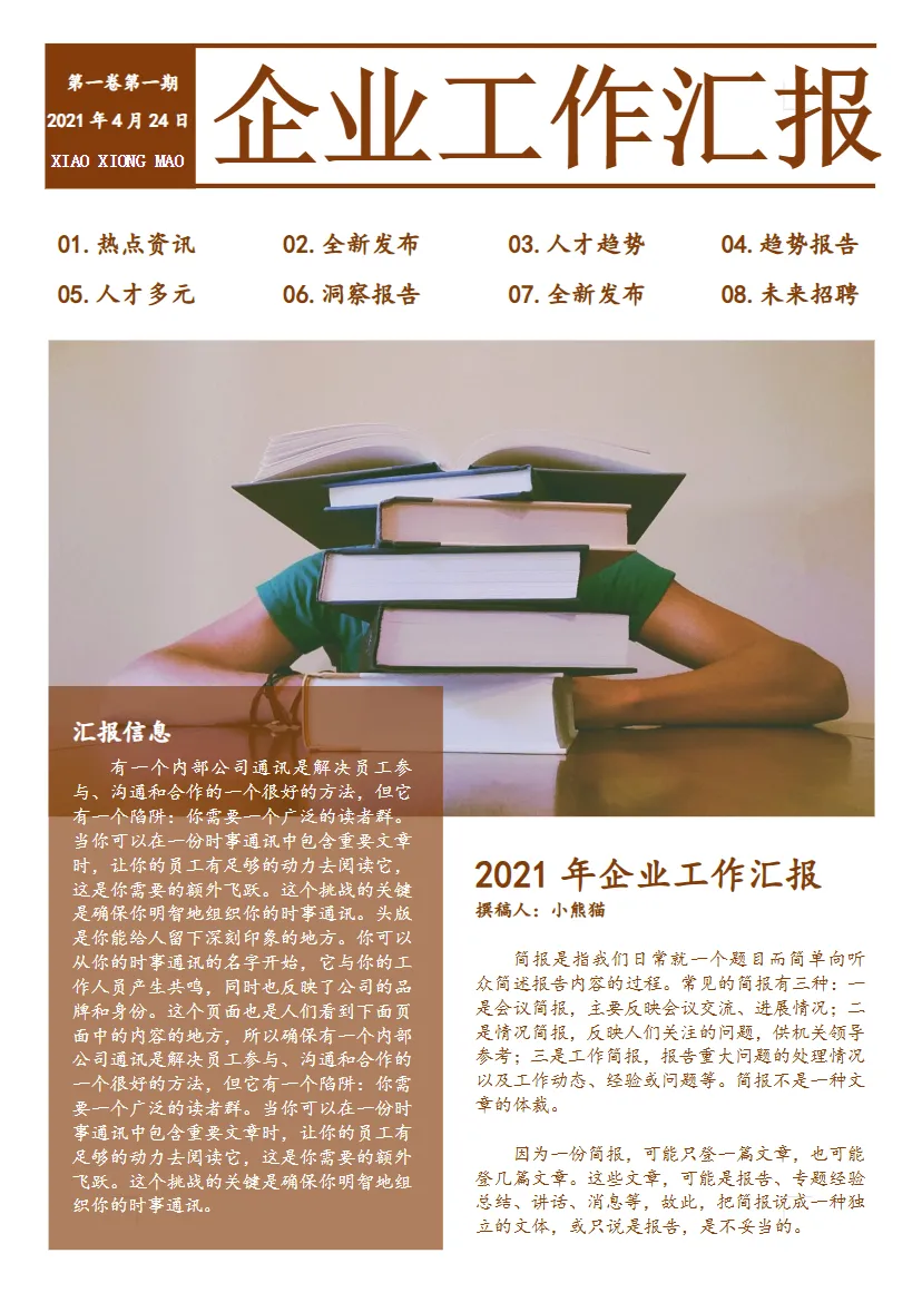 为您精选56套工作简报、周报、日报模板合集,本合集旨在帮助职场人高效完成工作总结与团队汇报,系统化项目进度跟踪与个人工作记录,助您节省时间,呈现专业清晰的汇报内容,模板均可修改打印