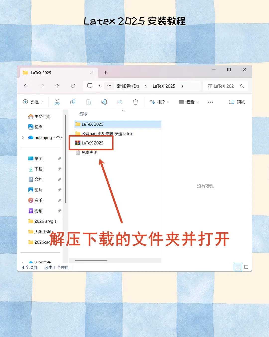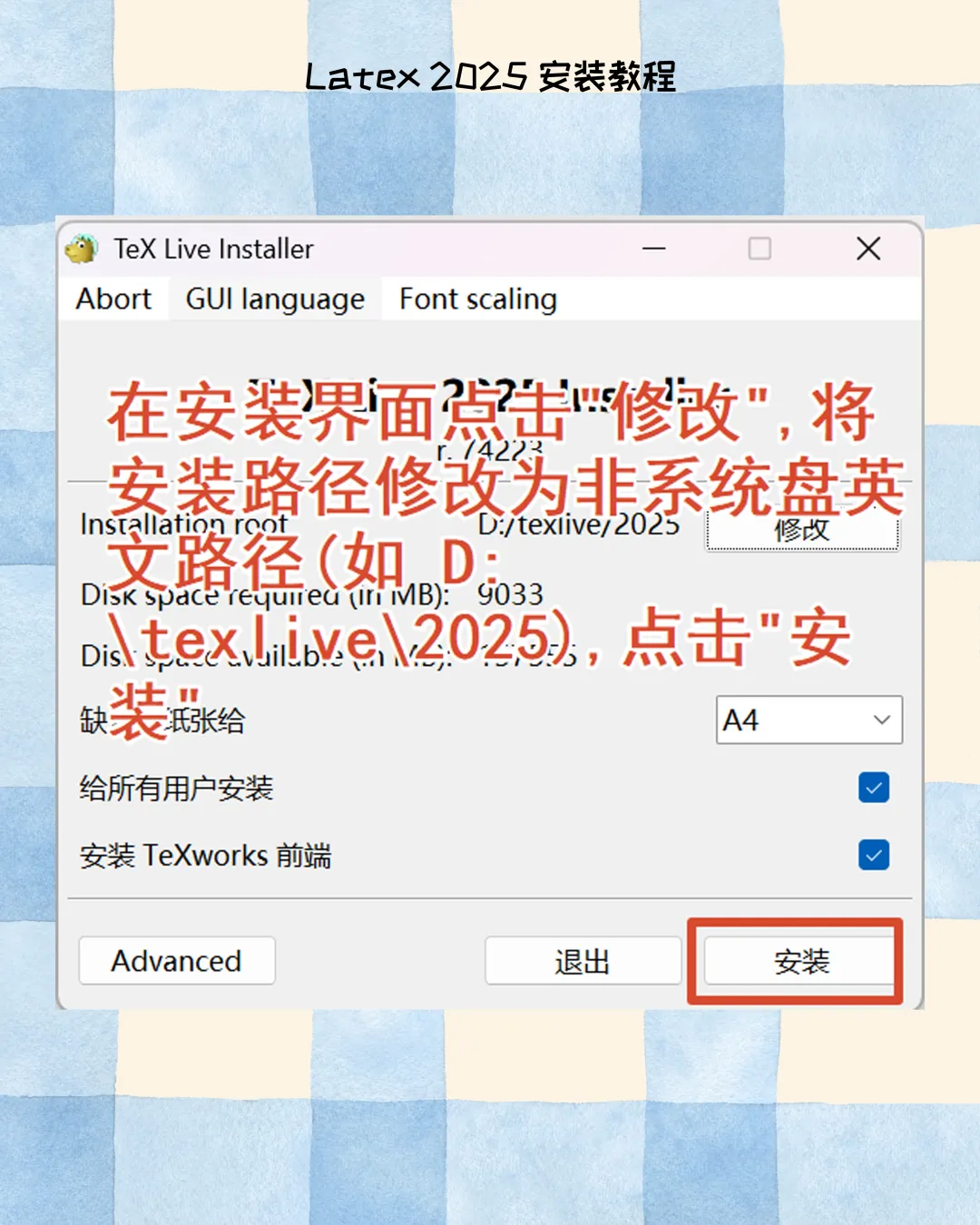 3. 修改安装路径:更改安装目录至非系统盘,推荐路径:D:\texlive\2026,杜绝中文与空格。