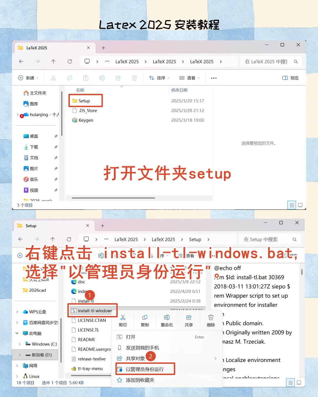 1. 权限启动安装器:右键install-tl-windows.exe,选择【以管理员身份运行】。