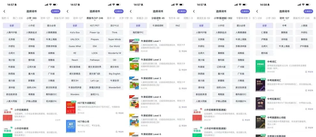 对于处于升学阶段的学习者,万词王APP同步了全国各地区的小学、初中、高中的教材,以及剑桥、新概念、牛津树等词书;