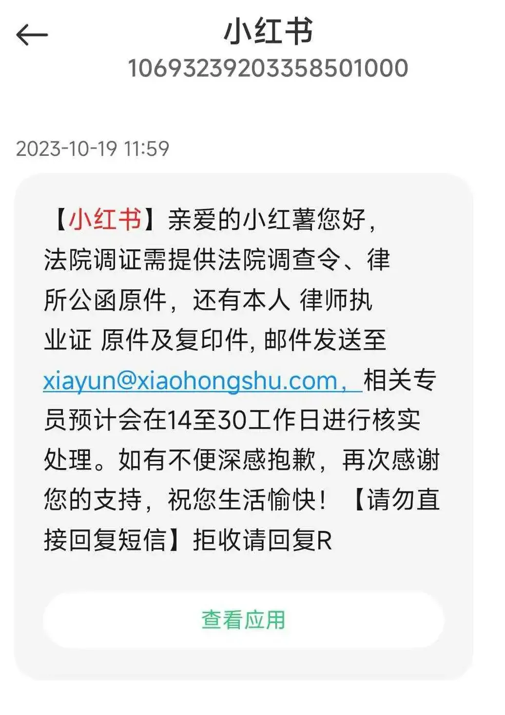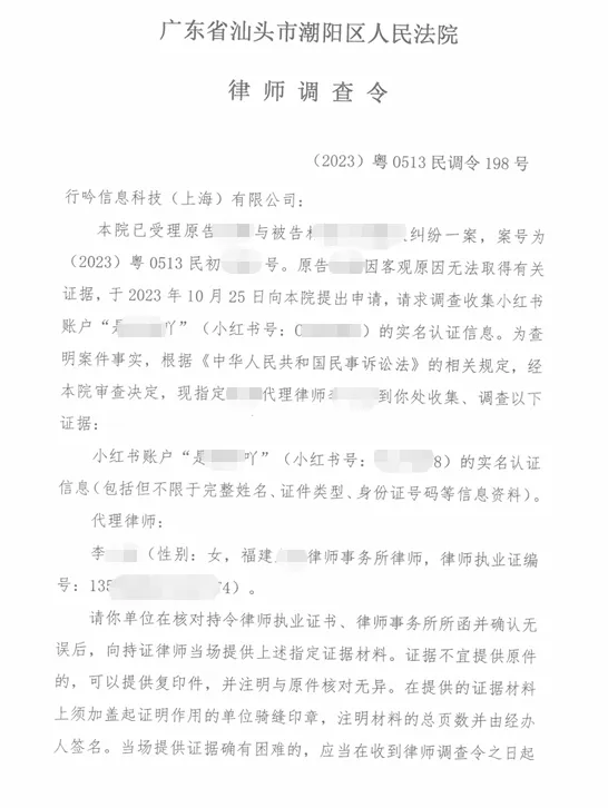 怎么调取小红书APP账号实名认证信息?新朋友点击☝☝蓝色关注我如有法律问题,请联系李律师18859223782(微信同号)1.向法院出具“调查令申请书”;2.法院出具调查令(盖章版)以及调查令(回执单)。3.持有调查令、律师证、介绍信,发送至小红书邮箱。公司会把调查结果内容邮寄至法院。5.法院收到调查内容,长这样☟