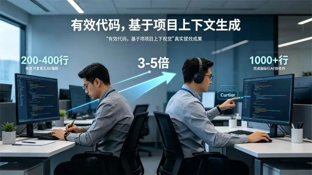 注意是"有效代码",不是AI随便生成的垃圾代码。因为Cursor生成的代码是基于你的项目上下文的,质量通常在7-8分(满分10分),经过简单review和调整就能用。