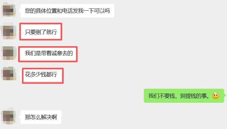 更令人匪夷所思的是,对方直接抛出“金钱诱惑”,明示只要删除稿件,多少钱都可即刻转账,还提出线下见面,标榜“带着诚意而来”。