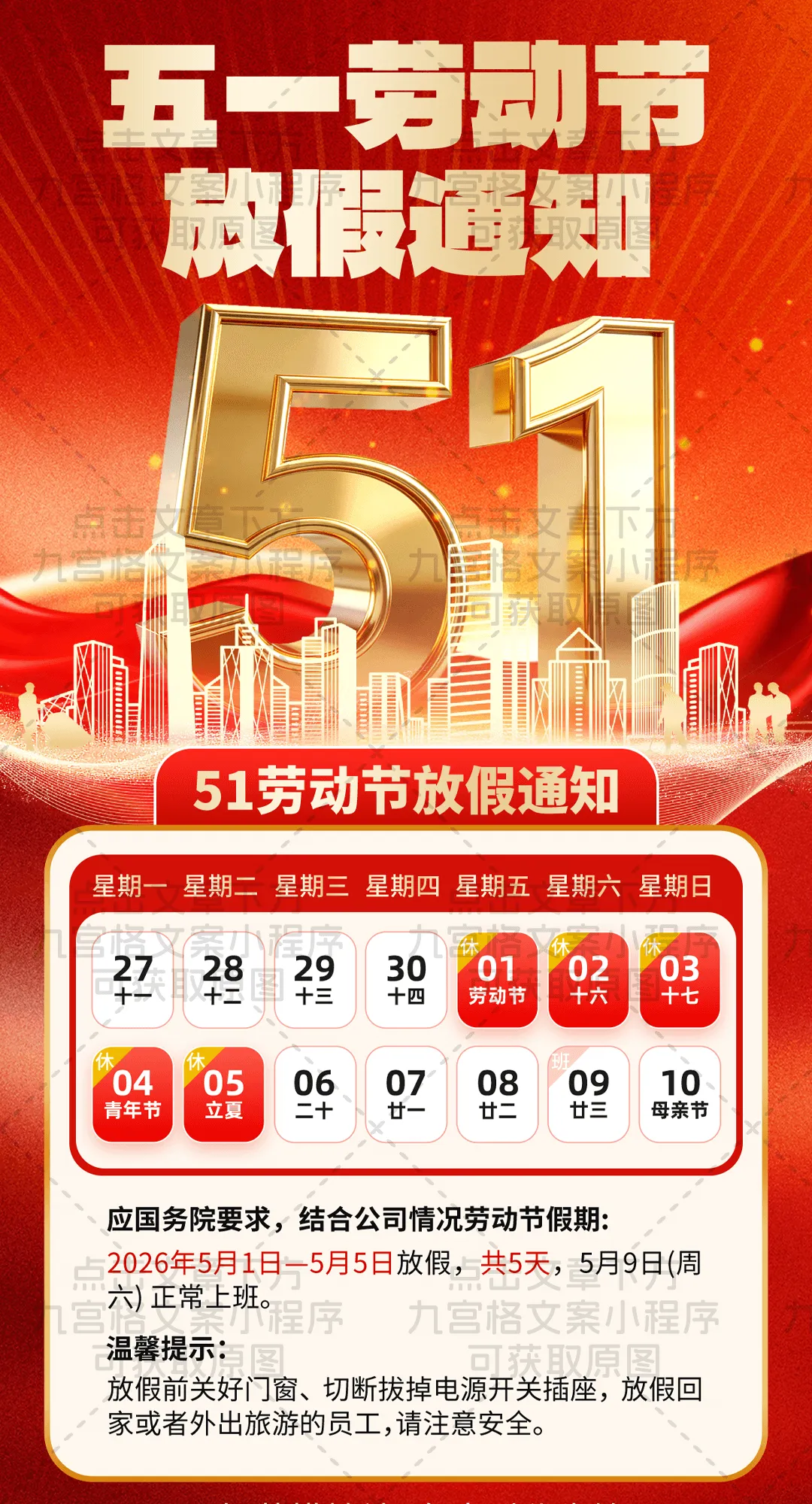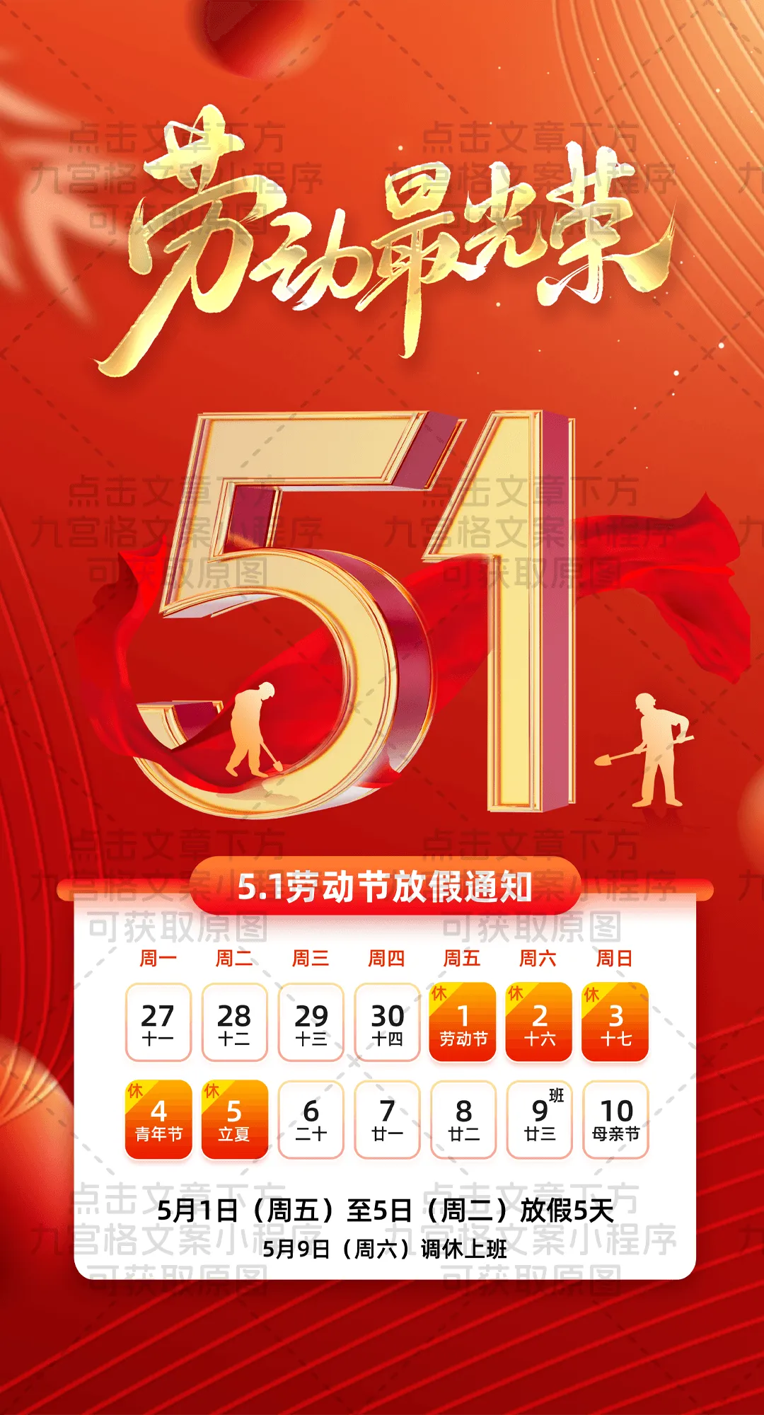 ✅ 调休补班:5月9日(周六)正常出勤,记得提前规划行程哦~