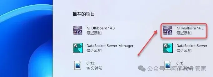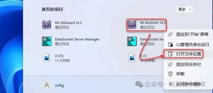 20.点击桌面任务栏中的【开始图标】,鼠标右击【NI Multisim 14.3】(可在所用应用或最近添加中找到)选择【打开文件位置】。