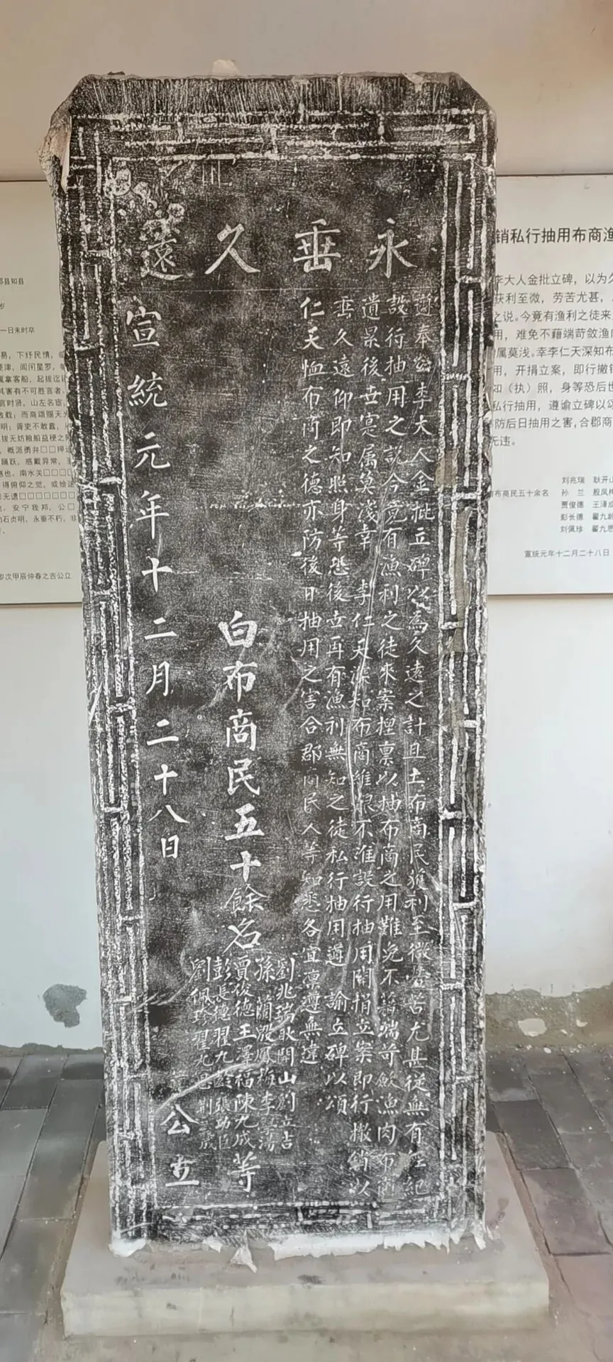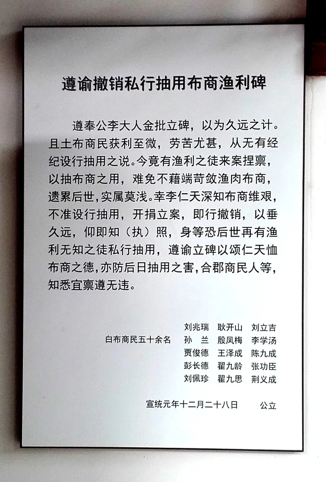 清咸丰年间,临清较大的白布商家有几十家,行业会首为刘兆瑞(我的祖上),字号有:刘兆瑞家的“义祥号”布庄、谷金榜家的“成记”布庄、王少卿家的“同心和”布庄、“大昌”布庄等,多为批发零售兼营。大宁寺院内保存的石碑碑文,记载了民国初年临清白布商人免税的则例,而碑文上的首位布商即我曾祖。