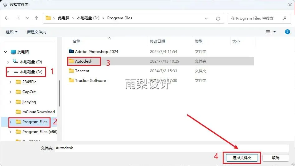 6.先选择【本地磁盘D】,再选择【Program Files】文件夹,最后新建一个文件夹(名称不能是中文);并点击【选择文件夹】