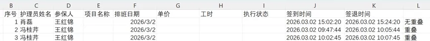 要判断C列同一个护理人多行签到签退时间有没有重叠,即上一个签退时间还没结束就开始签到下一个。J列是签到时间,K列是签退时间。