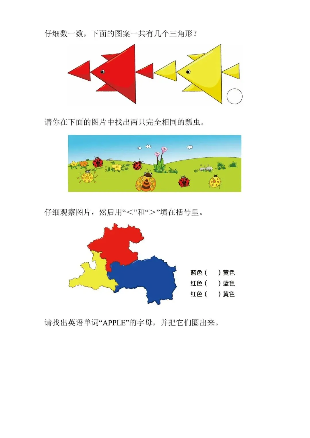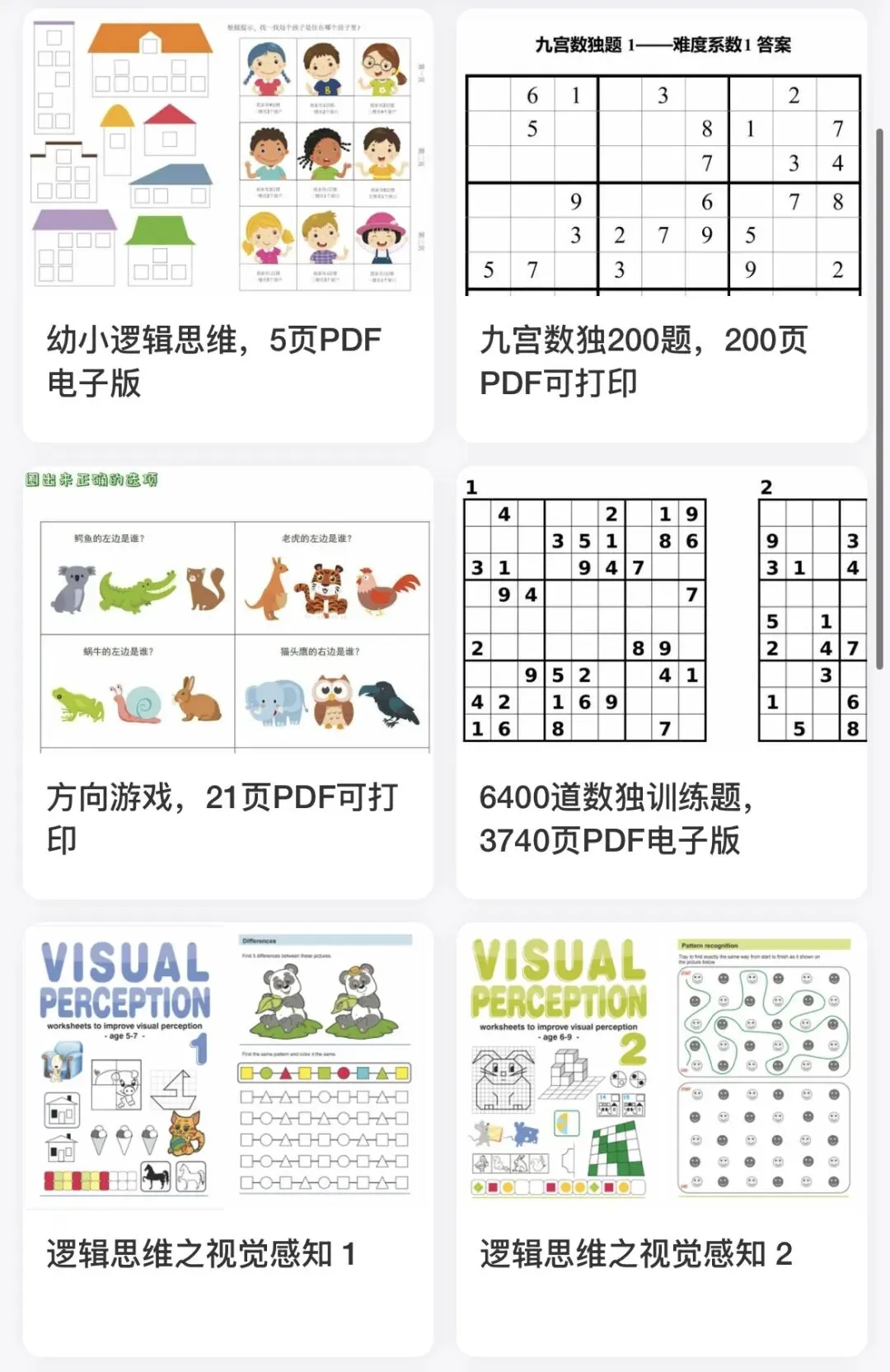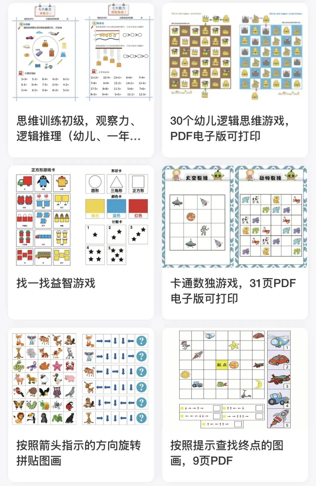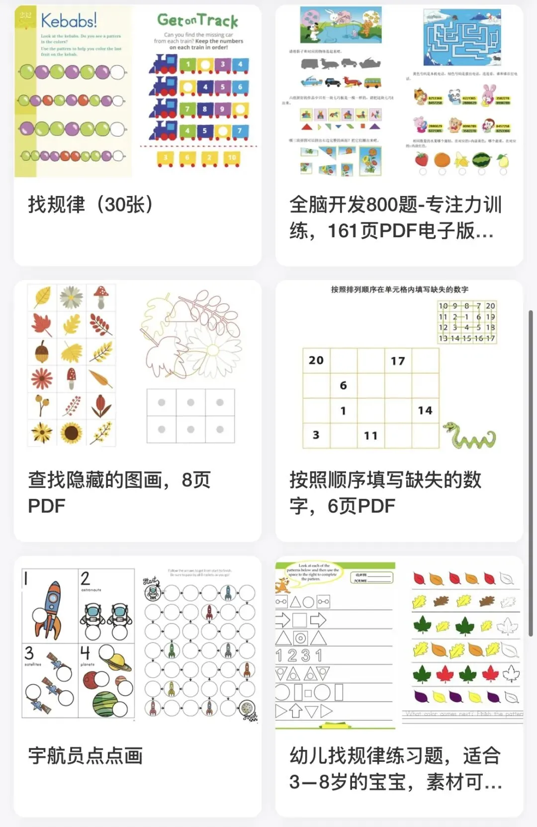 思维训练幼儿园可打印,专注力训练100天可打印大家好,这里是淘学学资料库,这份《全脑开发 800 题 - 专注力训练》,完整 pdf 电子档共 161 页。这份资料包含海量趣味题型,有找不同、数图形、走迷宫、连线配对、规律推理、简单计算、常识判断等,全面训练孩子观察力、专注力、逻辑思维与手眼协调能力,题型丰富有趣,贴合低龄孩子认知特点。这份全脑开发资料覆盖语言理解、数学能力、常识认知、分析比较、逻辑推理等十大能力训练,由浅入深循序渐进,附带完整答案,既能让孩子在趣味练习中提升专注力,又能开发大脑潜能、培养细致认真的学习习惯,适合学前及低年级孩子日常训练、智力启蒙,是全面提升综合能力的优质资料。(公众号底部菜单查看完整pdf获取方式)01截图预览(因篇幅有限,仅展示部分内容)02文件目录全脑开发800题-专注力训练.PDF (161页)03获取方式公众号底部菜单查看完整pdf获取方式END