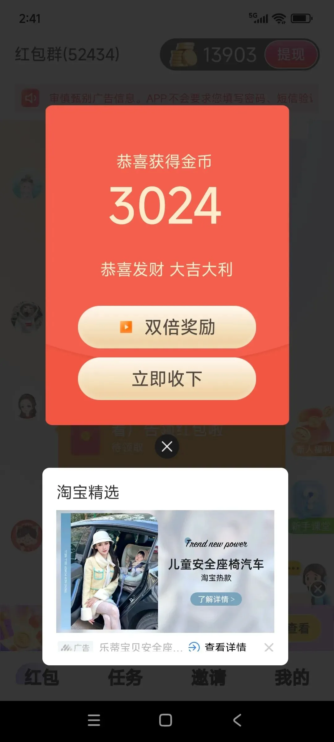 然后进入的就是一个虚拟的红包群(如下图),会弹出广告,广告类型不同,所有的弹窗广告一定要完播,不要跳过,完整观看才能获得金币!