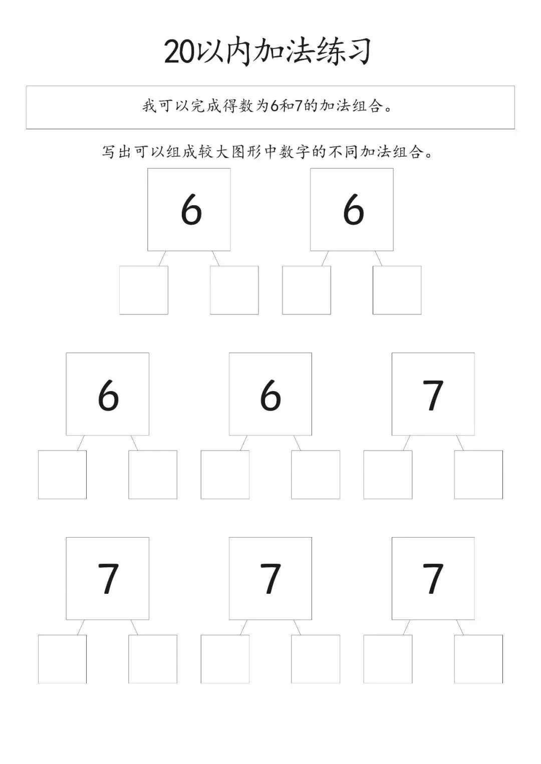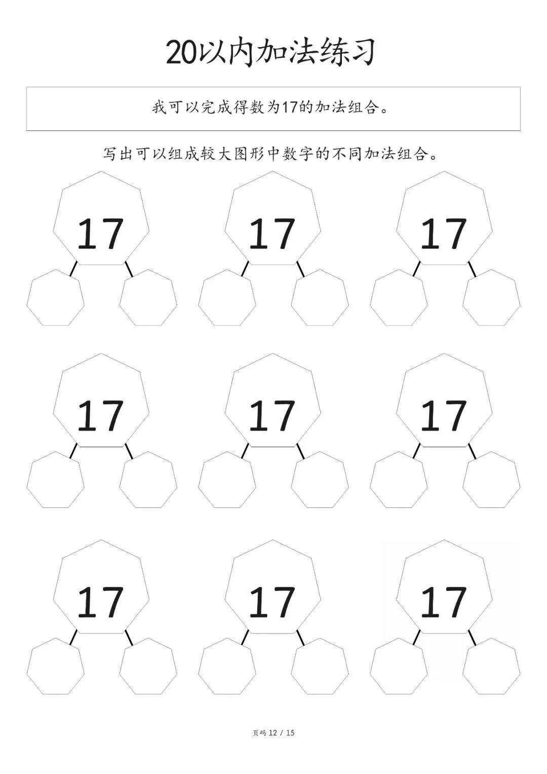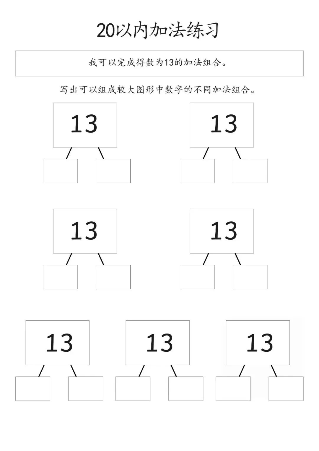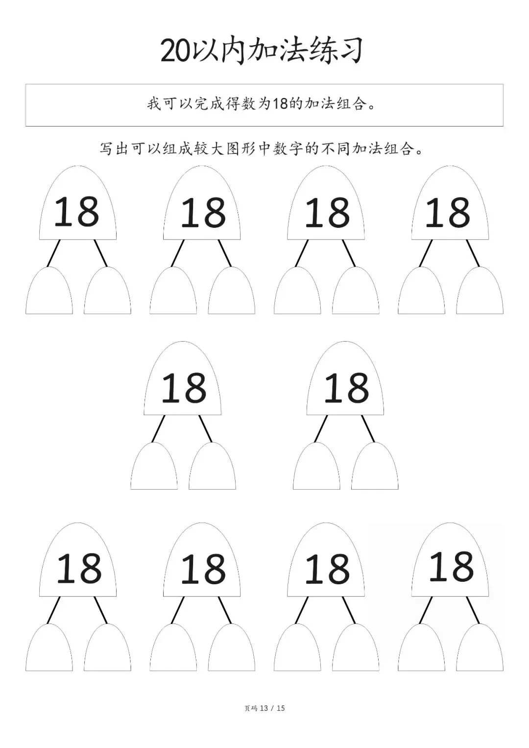 20以内加减法打印版pdf,20以内数的分解图大家好,这里是淘学学资料库,这份《20 以内加减法分合练习》,完整 pdf 电子档共 15 页。这份练习资料专为低年级孩子设计,聚焦 20 以内加法分合训练,按得数从 0 到 20 依次编排,循序渐进引导孩子写出不同数字的加法组合,从基础得数 0、1、2、3 开始,逐步过渡到 4、5 至 20,题型简单清晰,侧重数字拆分与组合能力培养,适合孩子夯实口算基础,提升计算熟练度。这份资料整体结构清晰,以得数为分类标准,每个数字都预留充足书写位置,方便孩子反复练习不同加法算式,从易到难逐步掌握 20 以内加法规律,帮助孩子熟练完成数字分合,强化加法运算思维,无复杂题型,专注基础口算训练,能有效帮助孩子打好算术基本功,适合日常巩固练习。(公众号底部菜单查看完整pdf获取方式)