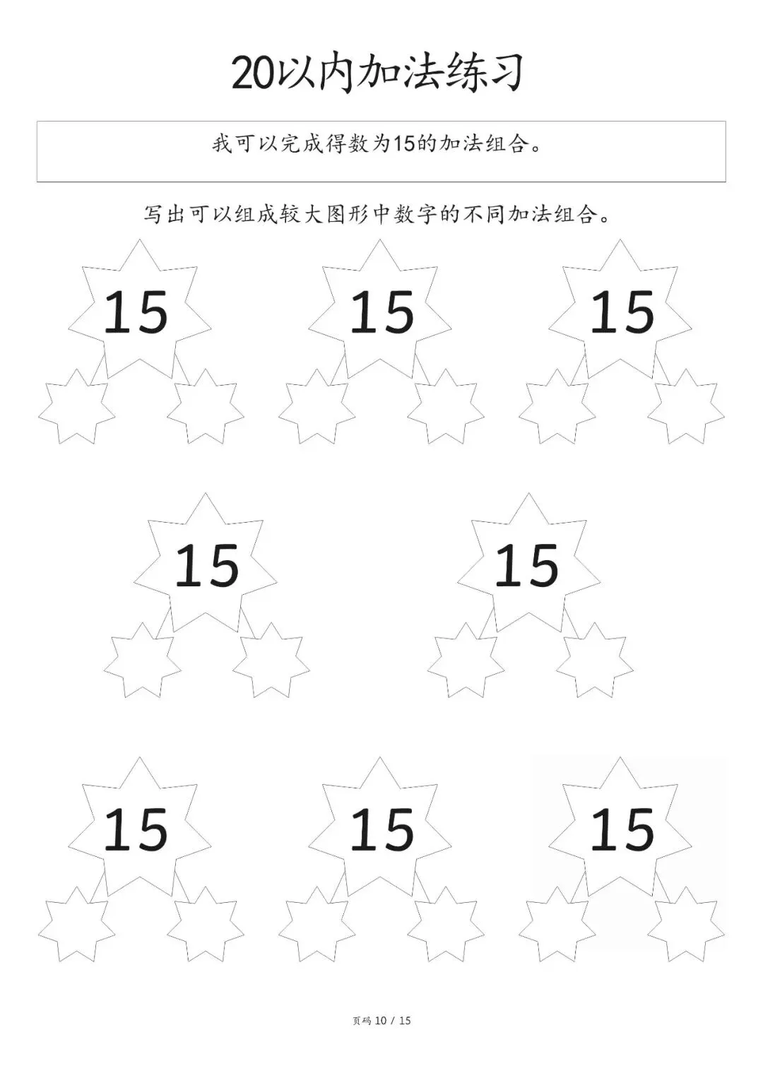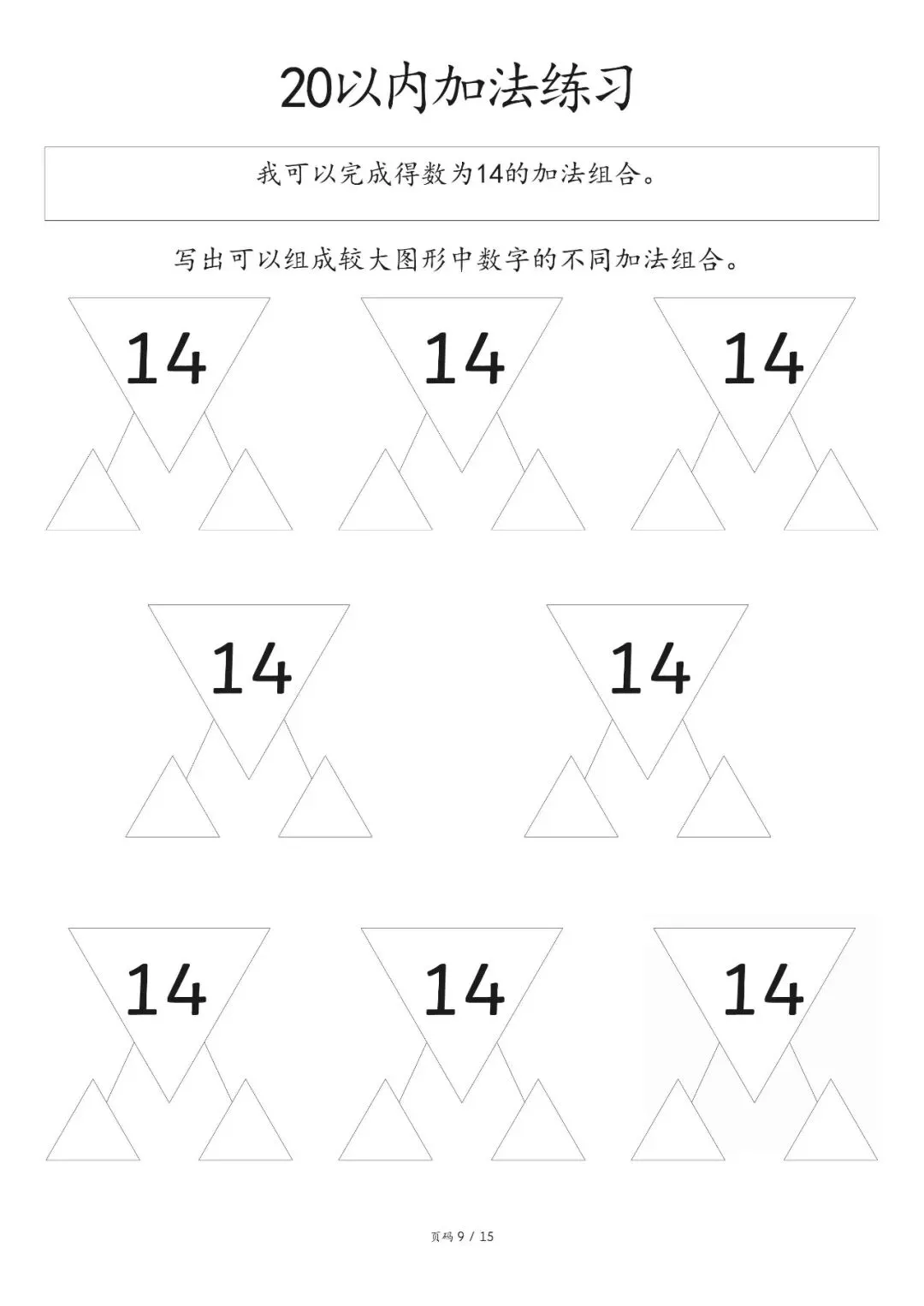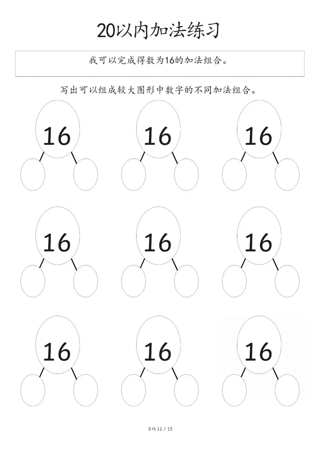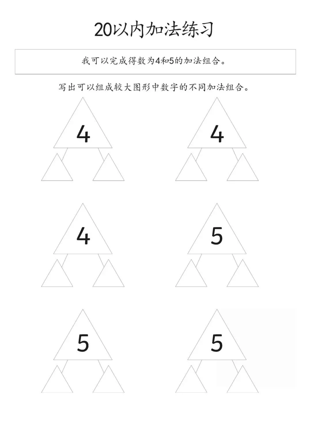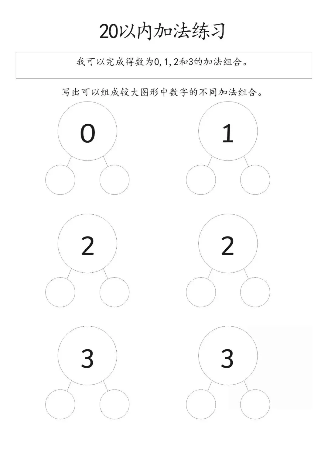20以内加减法打印版pdf,20以内数的分解图大家好,这里是淘学学资料库,这份《20 以内加减法分合练习》,完整 pdf 电子档共 15 页。这份练习资料专为低年级孩子设计,聚焦 20 以内加法分合训练,按得数从 0 到 20 依次编排,循序渐进引导孩子写出不同数字的加法组合,从基础得数 0、1、2、3 开始,逐步过渡到 4、5 至 20,题型简单清晰,侧重数字拆分与组合能力培养,适合孩子夯实口算基础,提升计算熟练度。这份资料整体结构清晰,以得数为分类标准,每个数字都预留充足书写位置,方便孩子反复练习不同加法算式,从易到难逐步掌握 20 以内加法规律,帮助孩子熟练完成数字分合,强化加法运算思维,无复杂题型,专注基础口算训练,能有效帮助孩子打好算术基本功,适合日常巩固练习。(公众号底部菜单查看完整pdf获取方式)