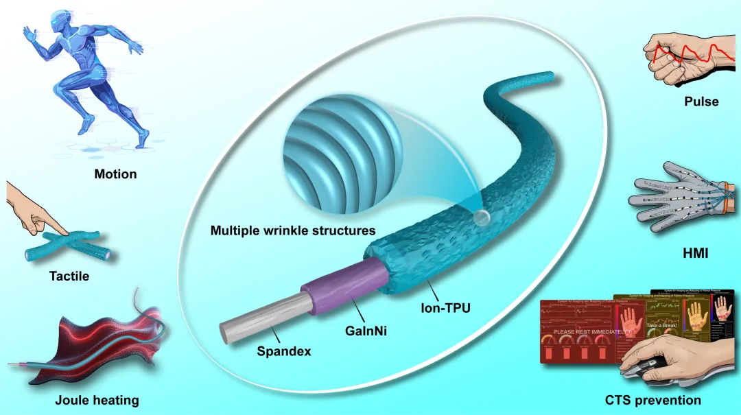 柔性纤维传感器作为实现健康“无感监测”的理想载体,在个性化医疗领域具有重要的应用前景。然而,如何在简化制备工艺的同时,突破灵敏度瓶颈并实现多功能集成,仍是当前该领域面临的挑战。近日,吕永钢教授团队在《npj Flexible Electronics》上发表了题为“Multifunctional Theranostic Fiber with Micro-Wrinkles for Closed-Loop Health Monitoring and Human-Machine Interaction”的研究论文。研究团队通过非模板化的制备策略,构筑了具有微褶皱形貌的离电型传感纤维(ionic wrinkled fiber, IWF),并探讨了其在双模态感知、人机交互以及闭环健康管理中的应用(图1)。