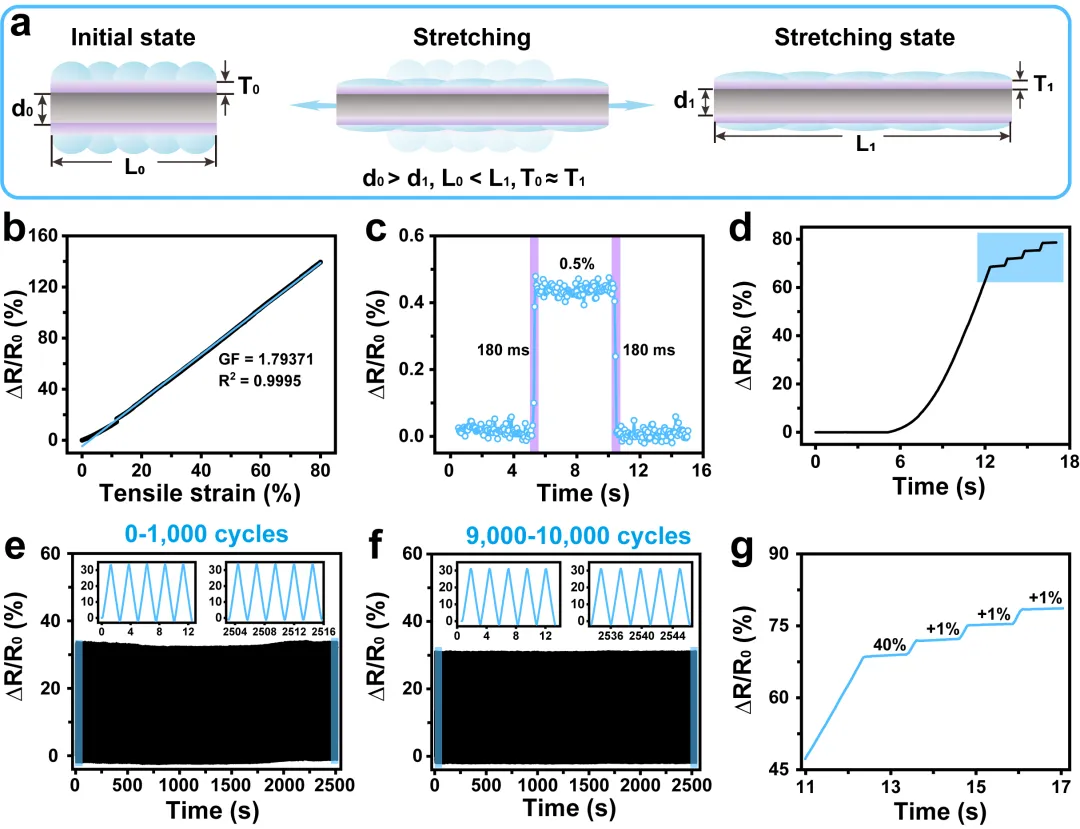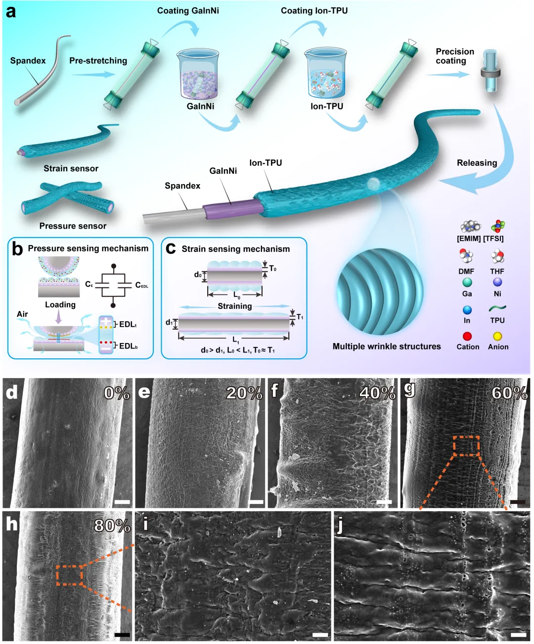 研究团队通过“预拉伸–涂覆–释放”的非模板化策略,实现了纤维表面微褶皱结构的原位构筑(图2a),化解了传统二维微纳加工与一维纤维基底的适配难题。辅以离子液体掺杂的壳层(图2b),不仅保留了纤维的柔韧性,更从物理层面显著拓展了传感器的受力形变空间(图2c)。实验表明,通过调控0%至80%的预应变参数,可实现对纤维表面褶皱形貌的连续、可控调节,其微观演变规律在扫描电镜表征中得到了直观验证(图2d-j)。