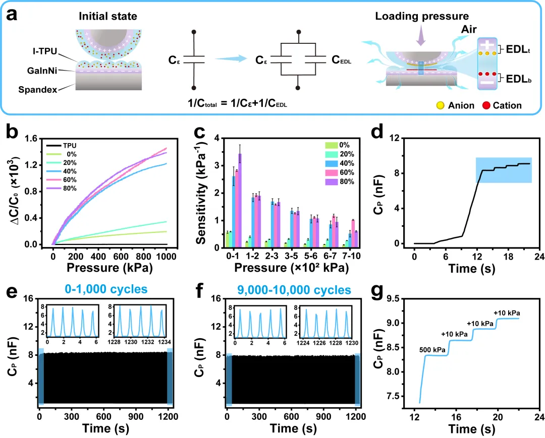 研究团队对压力传感性能及其内在机理进行了分析。IWF的压力感知核心在于材料体系与微观结构的协同设计,器件利用了微褶皱结构与离子介电层界面处的EDL电容效应。当受到外部压力时,微褶皱形貌发生几何形变,结合脊部的应力集中效应,将压力变化转化为面积变化,使得柔性纤维交叉点处的有效接触面积显著增大,有效放大了界面处的电荷积聚量,实现了对微小压力信号的放大与高灵敏捕捉(图3a)。得益于上述机制,传感器在0-100 kPa压力范围内展现出高达2.8 kPa-1的灵敏度(图3b, c)。即便处于500 kPa的高静态背景压力环境中,它仍能敏锐且准确地识别出10 kPa的微小压力阶跃(图3d和图3g)。此外,历经10,000次的压力循环疲劳测试,传感信号的基线与峰值输出保持稳定,证明了微褶皱结构与离子介电层在长期机械负荷下的结构完整性与循环稳定性(图3e和图3f)。