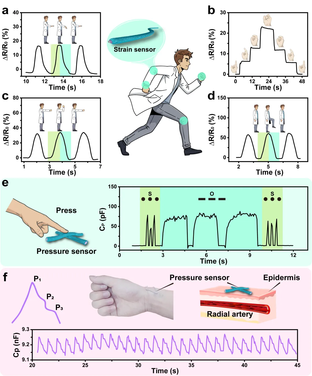凭借高灵敏度与低检测限,该传感纤维在多场景下展现出优良的监测与交互能力。在日常活动中,它能够实时追踪人体的典型关节动作(图5a-d);在交互应用中,研究团队通过定义压力信号的按压时长,赋予了其基于摩斯电码的信息编译功能(如紧急信号“SOS”,图5e);此外,该纤维对微弱生理信号同样具备敏锐的捕捉能力,可稳定记录桡动脉脉搏的特征波形(图5f),进而拓宽了其在智能化健康管理与人机交互领域的应用边界。
