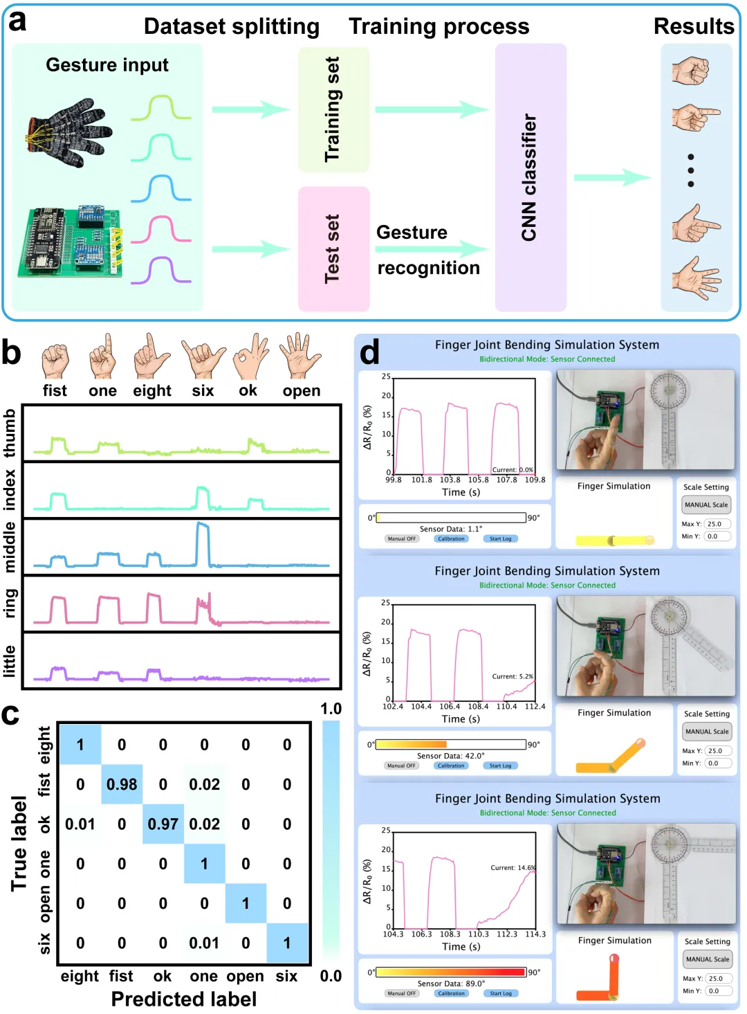 结合卷积神经网络算法,研究团队构建了智能手套交互系统。该系统通过采集6种典型手势的特征信号进行学习,最终实现了99.17%的平均识别率(图6a-c)。实验验证表明,手指弯曲的物理信号可实时映射至外部仿真执行机构(如舵机控制系统),展现了该传感器作为机器人控制接口与虚拟现实交互媒介的应用潜力(图6d)。