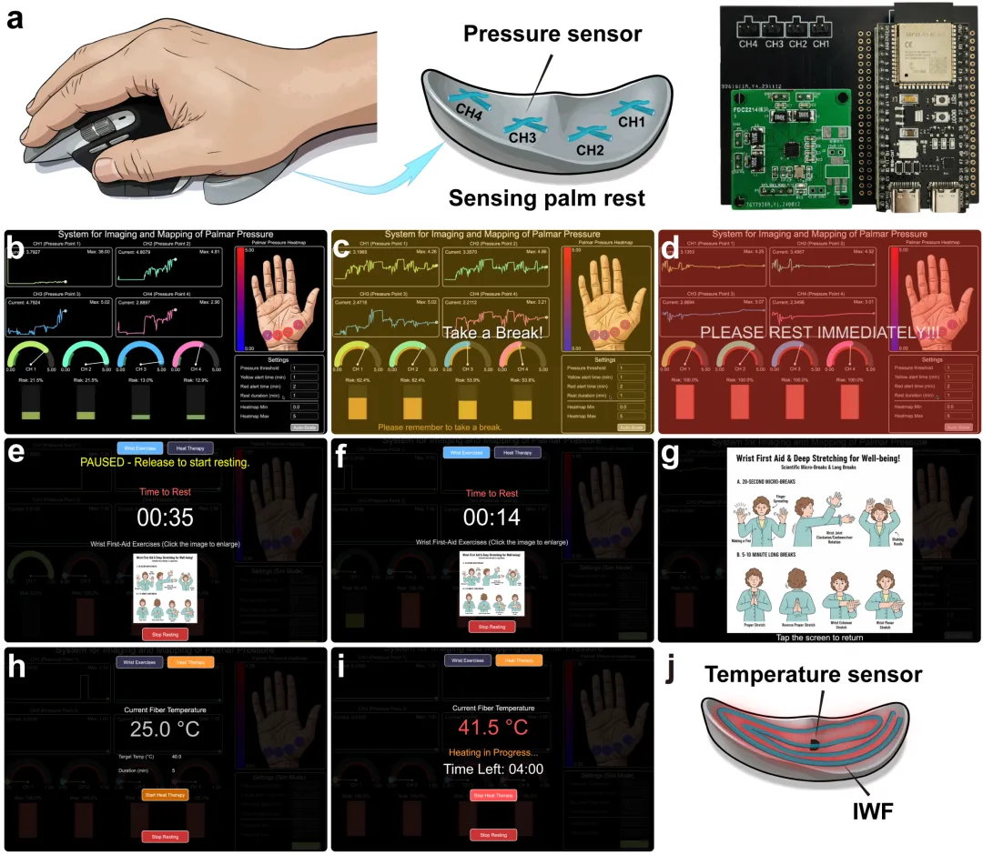 针对职业病(如CTS)的预防与治疗,研究团队开发了一套智能化监护系统(图7a和图7j)。该系统不仅能监测压力负荷并进行多级预警(图7b-d),还特别引入了“接触互锁逻辑”:即通过压力触发判定,只有在受试者手腕完全脱离传感区域时,系统才会启动休息倒计时,从逻辑底层杜绝了“假性休息”现象(图7e)。休息期间系统会提供放松指导和热敷干预供用户选择(图7e, f)。在热干预阶段,自适应温控调节程序将温度波动严格限制在2°C以内,保障了辅助治疗过程的有效性与安全性(图7h, i)。