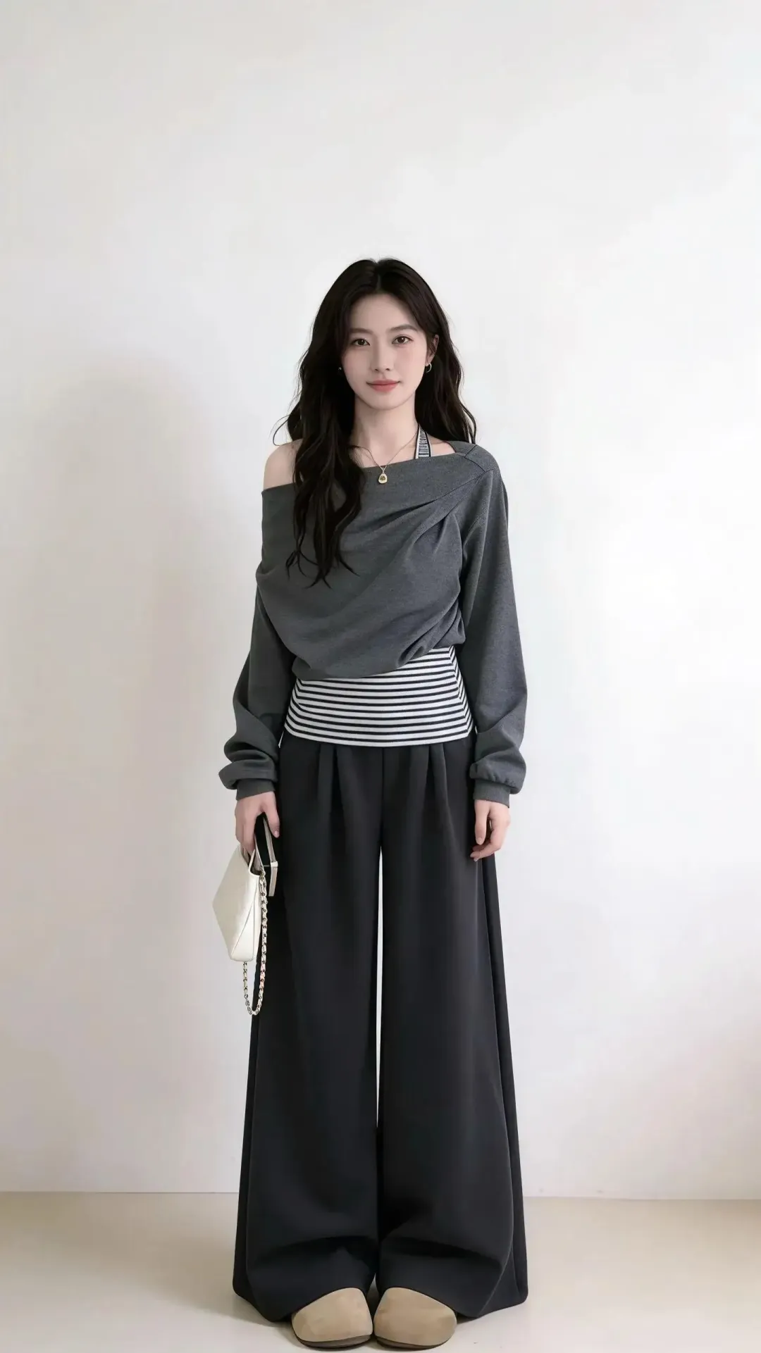 我盯着图1腰上那圈黑白条纹看了挺久,整套的命门就在这儿。灰色斜肩上衣本来是很容易往下坠的,尤其这种软软的针织,换成纯灰下装,立刻就会糊成一片。