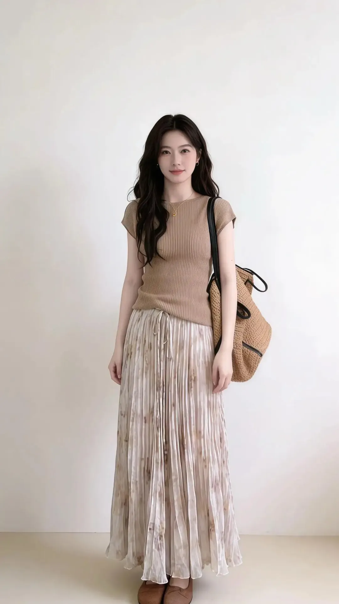 很多人都说,小个子别碰长裙。但我发现长到脚面的轻薄百褶裙,反而比小腿中段更不挑人。因为视线会一直往下走,中间不断。前提也很明确⚠️:上半身得收一点,像图里这种贴身短袖就行;如果上面也松,整个人会像一根移动的窗帘。我有次穿宽T加这种软裙去吃饭,坐下时裙摆全堆腿上,站起来还挂着椅角,场面非常狼狈。后来我学乖了,穿这类裙子先试坐下,看它是散开还是团住,坐着不乱,出门才安心。