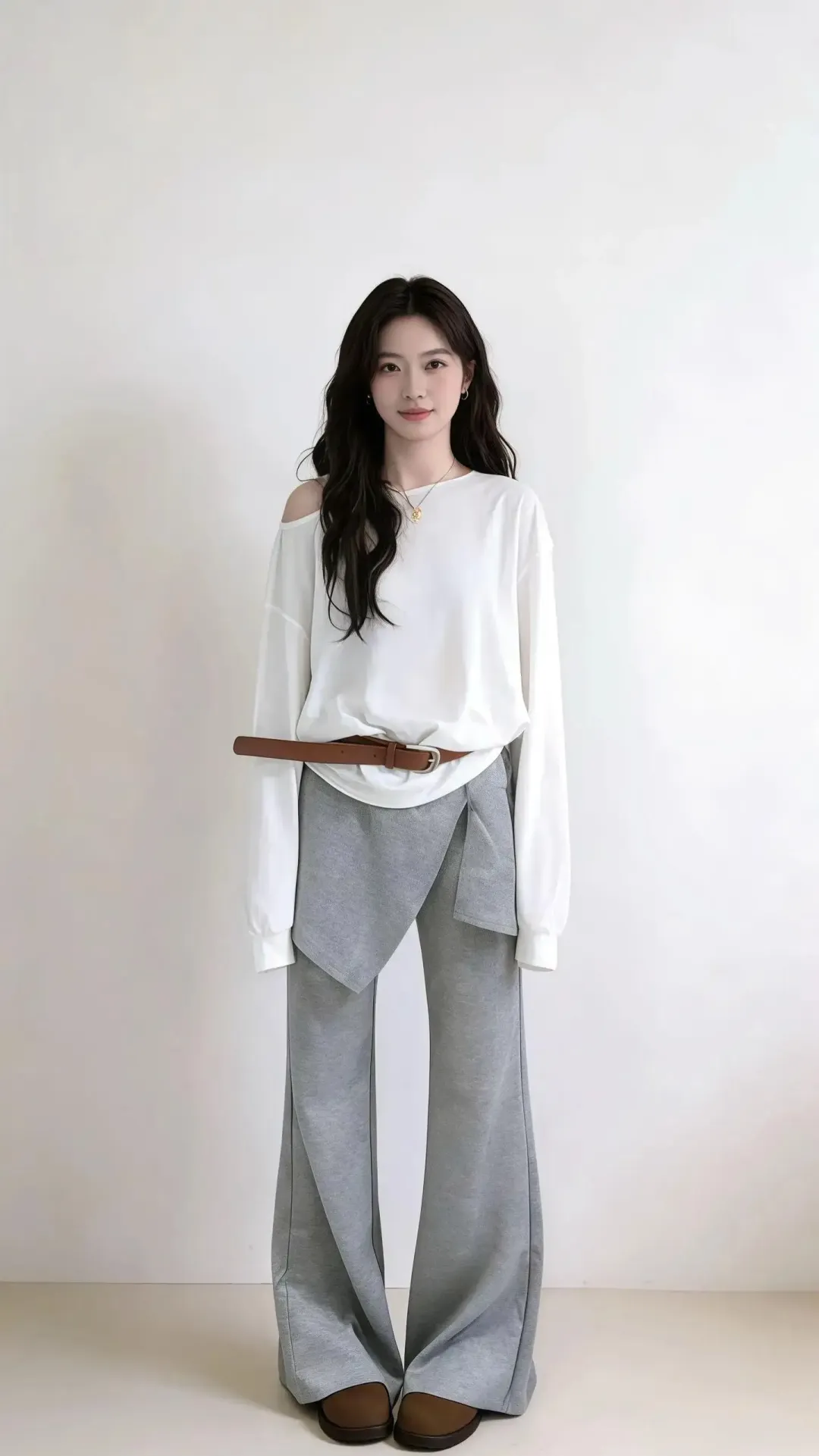 这套很像“看着没做什么,其实每一步都算过”。白上衣、灰裤子,本来容易寡淡,可那根棕色腰带一横,画面立刻有了停顿点。💡