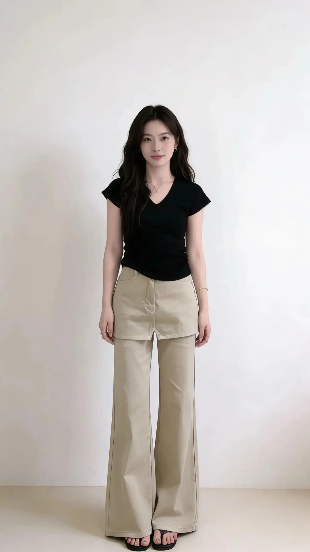 大家都说黑色最稳,我以前也信。后来发现,黑色一旦是薄面料,反而最容易暴露廉价感,尤其室内顶光一打,褶子和贴肉痕迹都出来了。图里这件能成立,是因为版型够干净,V领开得也克制。还有个小细节,鞋子没有抢戏,脚背露一点,线条就接上了。小腿偏圆的人别硬露一大截脚踝,裤脚盖住脚背一点点,比空出太多更利索。❌我以前夏末最爱九分裤,照片好看,真人一走路,小腿那截被放大得特别明显。