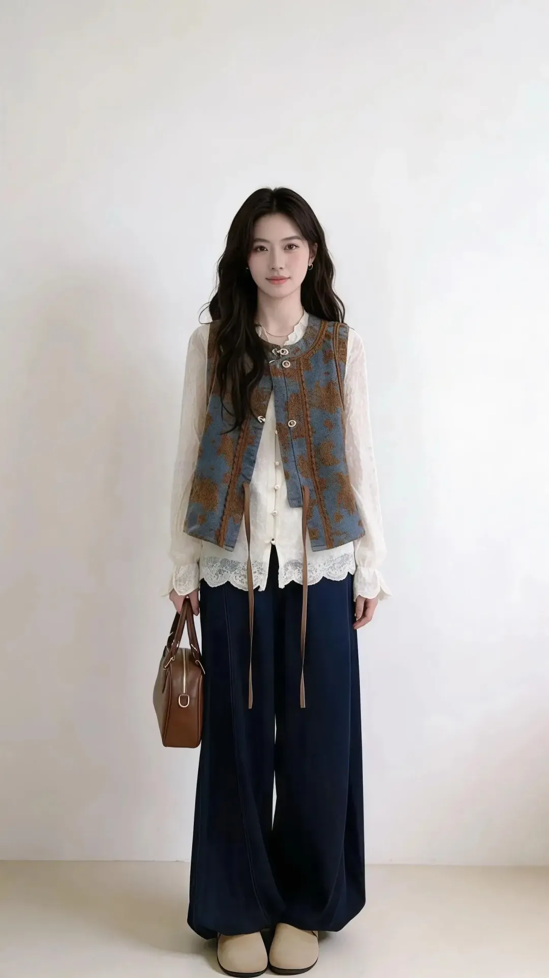 白衬衫单穿容易散,特别是这种带花边、带点软感的料子,没东西压着就会飘。加一件短马甲,肩膀和前胸立刻有骨架,下面再接深色宽裤,整个人稳很多。闺蜜估计会吐槽这套有点文艺过头,但她八成也会承认,长短层次是真的清楚。我自己翻车过一次,衬衫长、马甲也长、外套更长,三层全在胯部打架,照镜子那一刻我直接脱了重来。穿这种叠法,记住一个偷懒办法:最长那层放里面,最短那层卡在腰上面一点。✔️