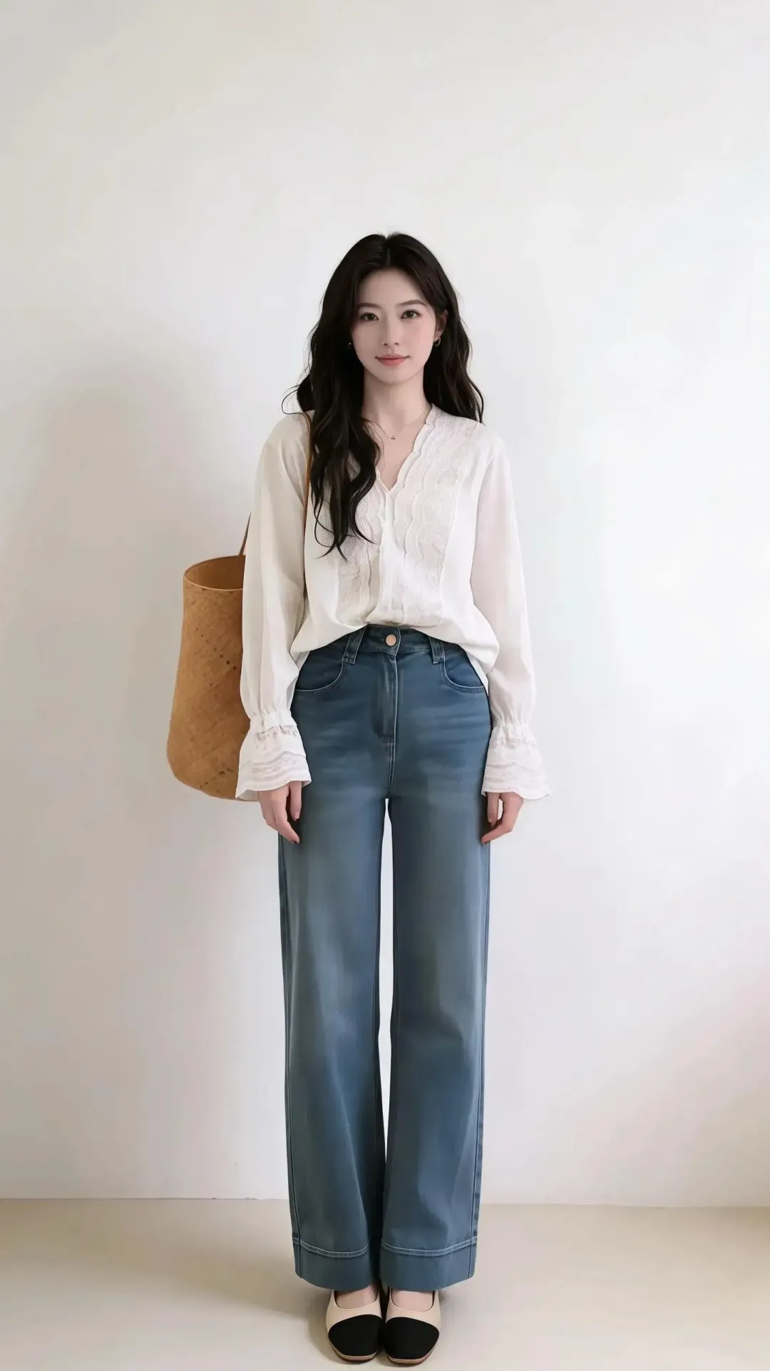 这件白衬衫好看,不是因为白,是因为领口开得浅,袖口有点戏,但没演过头。牛仔裤也不是硬挺直筒,是略微宽一点,裤脚几乎贴地,脚上那双浅色拼黑头鞋把人气一下拉回来。💰我买基础款吃过太多亏了,最贵的不一定最好穿,反倒是领口、袖口、裤脚这三个边缘,最值钱。边缘干净,整套就不容易垮。
