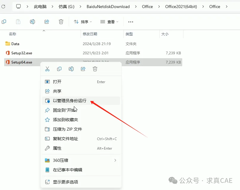2、进入Office安装包中的【Office】文件夹,右键单击Setup64.exe,然后以管理员身份运行